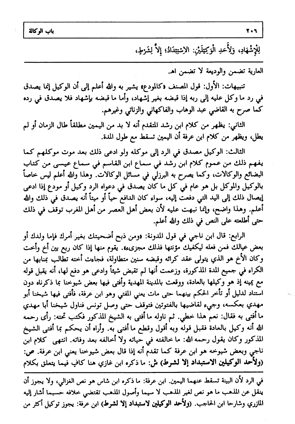 الرابع: قال ابن ناجي في قول المدونة: "ومن ذبح أضحيتك بغير أمرك فإما ولدك أو بعض عيالك فمن فعله ليكفيك مؤنتها فذلك مجزئ". يقوم منها إذا كان ربع بين أخ وأخت وكان الأخ هو الذي يتولى عقد كرائه وقبضه سنين متطاولة فجاءت أخته تطالب بمنابها من الكراء في جميع المدة المذكورة، وزعمت أنها لم تقبض شيئا، وادعى هو دفعه لها أنه يقبل قوله مع يمينه إذ هو وكيلها بالعادة، ووقعت بالمدينة المهدية، وأفتى فيها بعض شيوخنا بما ذكرناه دون استناد لدليل أو تأخر الحكم بينهما حتى مات يعني المفتي، وهو ابن عرفة فأفتى فيها شيخنا أبو مهدي بعكسه وجيء لقاضيها بالفتوتين فتوقف حتى وصل تونس فناول شيخنا أبا مهدي ما أفتى به فقال: نعم هذا خطي، ثم ناوله ما أفتى به الشيخ المذكور فكتب تحته رأى رحمه الله أنه وكيل بالعادة فقبل قوله وبه أقول وقطع ما أفتى به وأراه أن يحكم بما أفتى الشيخ المذكور وكان يقول رحمه الله ما خالفته في حياته ولا أخالفه بعد وفاته انتهى كلام ابن ناجي وبعض شيوخه هو ابن عرفة كما تقدم أنه إذا قال بعض شيوخنا يعني ابن عرفة. ص: (ولأحد الوكيلين الاستبداد إلا لشرط) ش: ما ذكره ابن غازي هنا كاف فيما يتعلق بكلام