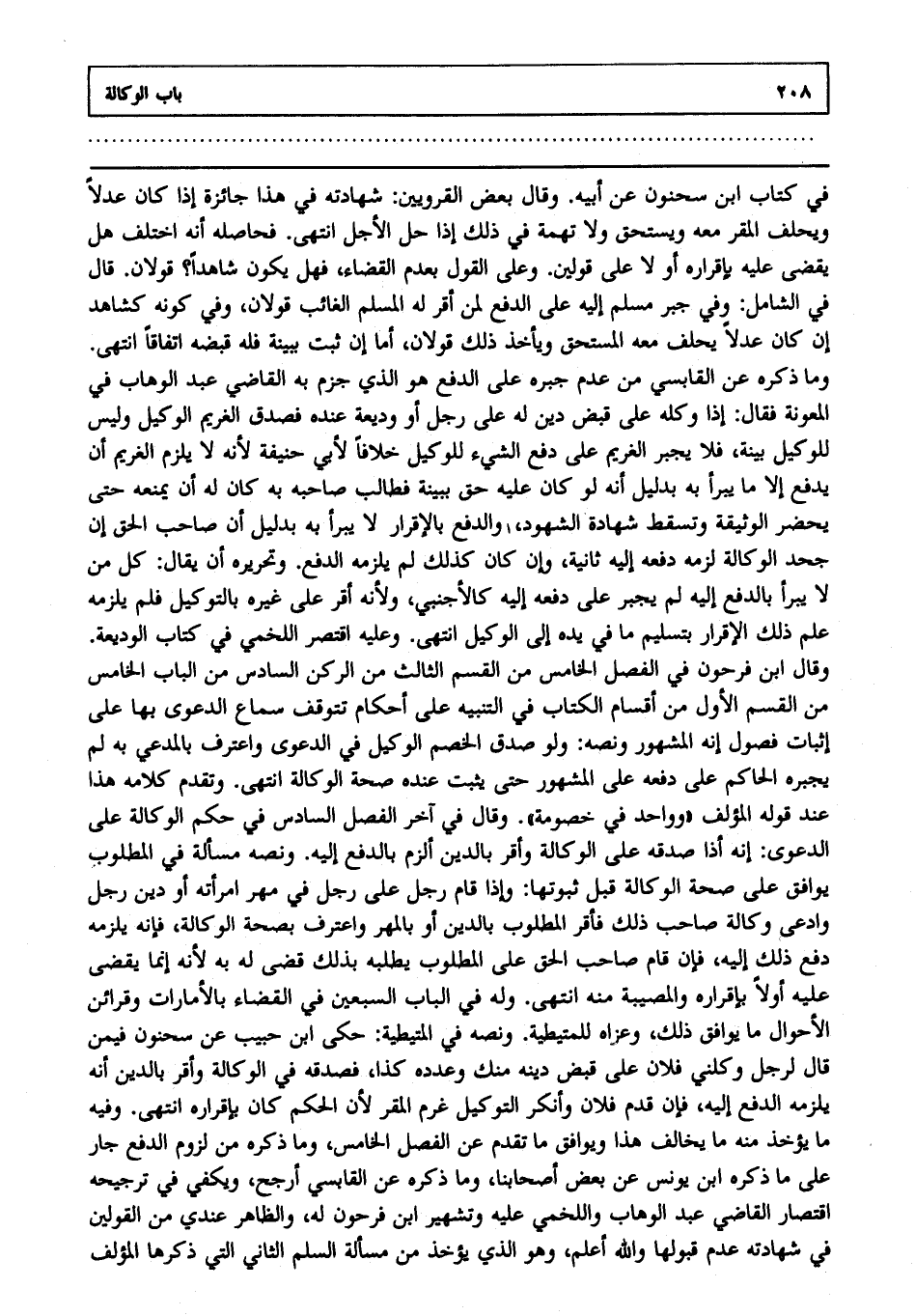 في كتاب ابن سحنون عن أبيه وقال بعض القرويين: شهادته في هذا جائزة إذا كان عدلا ويحلف المقر معه: ويستحق ولا تهمة في ذلك إذا حل الأجل انتهى. فحاصله أنه اختلف هل يقضى عليه بإقراره أو لا؟ على قولين وعلى القول بعدم القضاء فهل يكون شاهدا؟ قولان قال في الشامل وفي جبر مسلم إليه على الدفع لمن أقر له المسلم الغائب قولان وفي كونه كشاهد إن كان عدلا يحلف معه المستحق، ويأخذ ذلك قولان أما إن ثبت ببينة فله قبضه اتفاقا انتهى. وما ذكره عن القابسي من عدم جبره على الدفع هو الذي جزم به القاضي عبد الوهاب في المعونة فقال: إذا وكله على قبض دين له على رجل أو وديعة عنده فصدق الغريم الوكيل وليس للوكيل بينة، فلا يجبر الغريم على دفع الشيء للوكيل خلافا لأبي حنيفة؛ لأنه لا يلزم الغريم أن يدفع إلا ما يبرأ به بدليل أنه لو كان عليه حق ببينة، فطالب صاحبه به كان له أن يمنعه حتى يحضر الوثيقة، وتسقط شهادة الشهود والدفع بالإقرار لا يبرأ به بدليل أن صاحب الحق إن جحد الوكالة لزمه دفعه إليه ثانية وإن كان كذلك لم يلزمه الدفع وتحريره أن يقال كل من لا يبرأ بالدفع إليه لم يجبر على دفعه إليه كالأجنبي؛ ولأنه أقر على غيره بالتوكيل، فلم يلزمه علم ذلك الإقرار بتسليم ما في يده إلى الوكيل انتهى. وعليه اقتصر اللخمي في كتاب الوديعة وقال ابن فرحون في الفصل الخامس من القسم الثالث من الركن السادس من الباب الخامس من القسم الأول من أقسام الكتاب في التنبيه على أحكام تتوقف سماع الدعوى بها على إثبات فصول إنه المشهور ونصه، ولو صدق الخصم الوكيل في الدعوى، واعترف بالمدعى به لم يجبره الحاكم على دفعه على المشهور حتى يثبت عنده صحة الوكالة انتهى. وتقدم كلامه هذا عند قول المؤلف: "وواحد في خصومة". وقال في آخر الفصل السادس في حكم الوكالة على الدعوى: إنه إذا صدقه على الوكالة، وأقر بالدين ألزم بالدفع إليه. ونصه مسألة في المطلوب يوافق على صحة الوكالة قبل ثبوتها وإذا قام رجل على رجل في مهر امرأته أو دين رجل وادعى وكالة صاحب ذلك فأقر المطلوب بالدين أو بالمهر واعترف بصحة الوكالة، فإنه يلزمه دفع ذلك إليه، فإن قام صاحب الحق على المطلوب يطلبه بذلك قضى له به؛ لأنه إنما يقضى عليه أولا بإقراره والمصيبة منه انتهى. وله في الباب السبعين في القضاء بالأمارات وقرائن الأحوال ما يوافق ذلك وعزاه للمتيطية ونصه في المتيطية حكى ابن حبيب عن سحنون فيمن قال لرجل وكلني فلان على قبض دينه منك وعدده كذا فصدقه في الوكالة وأقر بالدين أنه يلزمه الدفع إليه. فإن قدم فلان وأنكر التوكيل غرم المقر؛ لأن الحكم كان بإقراره انتهى. وفيه ما يؤخذ منه ما يخالف هذا ويوافق ما تقدم عن الفصل الخامس وما ذكره من لزوم الدفع جار على ما ذكره ابن يونس عن بعض أصحابنا وما ذكره عن القابسي أرجح، ويكفي في ترجيحه اقتصار القاضي عبد الوهاب واللخمي عليه وتشهير ابن فرحون له والظاهر عندي من القولين في شهادته عدم قبولها والله أعلم. وهو الذي يؤخذ من مسألة السلم الثاني التي ذكرها المؤلف