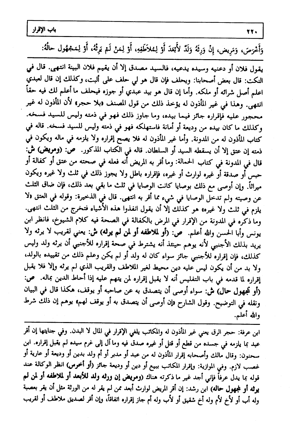 يقول فلان أودعنيه وسيده يدعيه فالسيد مصدق إلا أن يقيم فلان البينة انتهى. قال في النكت: قال بعض أصحابنا: ويحلف فإن قال هو لي حلف على البت، وكذلك إن قال لعبدي أعلم أصل شرائه أو ملكه، وأما إن قال هو بيد عبدي أو حوزه فيحلف ما أعلم لك فيه حقا انتهى، وهذا في غير المأذون له يؤخذ ذلك من قول المصنف "بلا حجر" لأن المأذون له غير محجور عليه، فإقراره جائز فيما بيده وما جاوز ذلك، فهو في ذمته وليس للسيد فسخه، وكذلك ما كان بيده من وديعة أو أمانة فاستهلكه، فهو في ذمته وليس للسيد فسخه قاله في كتاب المأذون له من المدونة، وأما غير المأذون له فلا يصح إقراره ولا يلزمه في ماله ويكون في ذمته إن عتق إلا أن يسقطه السيد أو السلطان قاله في الكتاب المذكور. ص: (ومريض) ش: قال في المدونة في كتاب الحمالة وما أقر به المريض أنه فعله في صحته من عتق أو كفالة أو حبس أو صدقة أو غيره لوارث أو غيره فإقراره باطل، ولا يجوز ذلك في ثلث ولا غيره، ويكون ميراثا وإن أوصى مع ذلك بوصايا كانت الوصايا في ثلث ما بقي بعد ذلك، فإن ضاق الثلث عن وصيته لم تدخل الوصايا في شيء مما أقر به انتهى قال في الذخيرة وقوله في العتق: "لا يلزم في ثلث ولا غيره" هو كذلك إلا أن يقول أنفذوا هذه الأشياء، فتخرج من الثلث انتهى، وما ذكره في المدونة من الإقرار في المرض بالكفالة في الصحة فيه كلام الشيوخ فانظر ابن يونس وأبا الحسن والله أعلم. ص: (أو لملاطفه أو لمن لم يرثه) ش: يعني لقريب لا يرثه، ولا يريد بذلك الأجنبي؛ لأنه يوهم حينئذ أنه يشترط في صحة إقراره للأجنبي أن يرثه ولد وليس كذلك فإن إقراره للأجنبي جائز سواء كان له ولد أو لم يكن وعلم ذلك من تقييده بالولد، ولا بد من أن يكون ليس عليه دين محيط لغير الملاطف والقريب الذي لم يرثه وإلا فلا يقبل إقراره لما قدمه في باب التفليس أنه لا يقبل إقراره لمن يتهم عليه إذا أحاط الدين بماله. ص: (أو مجهول حاله) ش: سواء أوصى أن يتصدق به عن صاحبه أو يوقف هكذا قال في البيان ونقله في التوضيح وقول الشارح: "إن أوصى أن يتصدق به أو يوقف لهم" يوهم أن ذلك شرط والله أعلم.