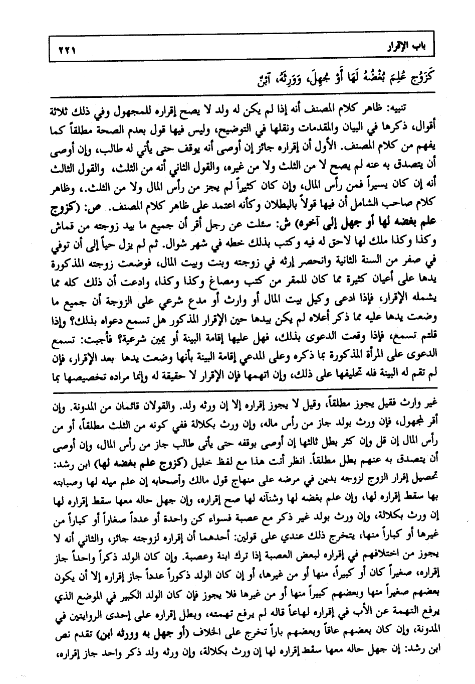 تنبيه: ظاهر كلام المصنف أنه إذا لم يكن له ولد لا يصح إقراره للمجهول وفي ذلك ثلاثة أقوال ذكرها في البيان والمقدمات ونقلها في التوضيح وليس فيها قول بعدم الصحة مطلقا كما يفهم من كلام المصنف الأول أن إقراره جائز إن أوصى أنه يوقف حتى يأتي له طالب وإن أوصى أن يتصدق به عنه لم يصح لا من الثلث ولا من غيره والقول الثاني أنه من الثلث والقول الثالث أنه إن كان يسيرا فمن رأس المال، وإن كان كثيرا لم يجز من رأس المال ولا من الثلث وظاهر كلام صاحب الشامل أن فيها قولا بالبطلان، وكأنه اعتمد على ظاهر كلام المصنف ص: (كزوج علم بغضه لها أو جهل إلى آخره) ش: سئلت عن رجل أقر أن جميع ما بيد زوجته من قماش وكذا وكذا ملك لها لا حق له فيه وكتب بذلك خطه في شهر شوال، ثم لم يزل حيا إلى أن توفي في صفر من السنة الثانية وانحصر إرثه في زوجته وبنت وبيت المال فوضعت زوجته المذكورة يدها على أعيان كثيرة مما كان للمقر من كتب ومصاغ وكذا وكذا وادعت أن ذلك كله مما يشمله الإقرار، فإذا ادعى وكيل بيت المال أو وارث أو مدع شرعي على الزوجة أن جميع ما وضعت يدها عليه مما ذكر أعلاه لم يكن بيدها حين الإقرار المذكور هل تسمع دعواه بذلك؟ وإذا قلتم تسمع فإذا وقعت الدعوى بذلك فهل عليها إقامة البينة أو يمين شرعية فأجبت تسمع الدعوى على المرأة المذكورة بما ذكره، وعلى المدعي إقامة البينة بأنها وضعت يدها بعد الإقرار فإن لم تقم له البينة، فله تحليفها على ذلك وإن اتهمها فإن الإقرار لا حقيقة له، وإنما مراده تخصيصها بما
