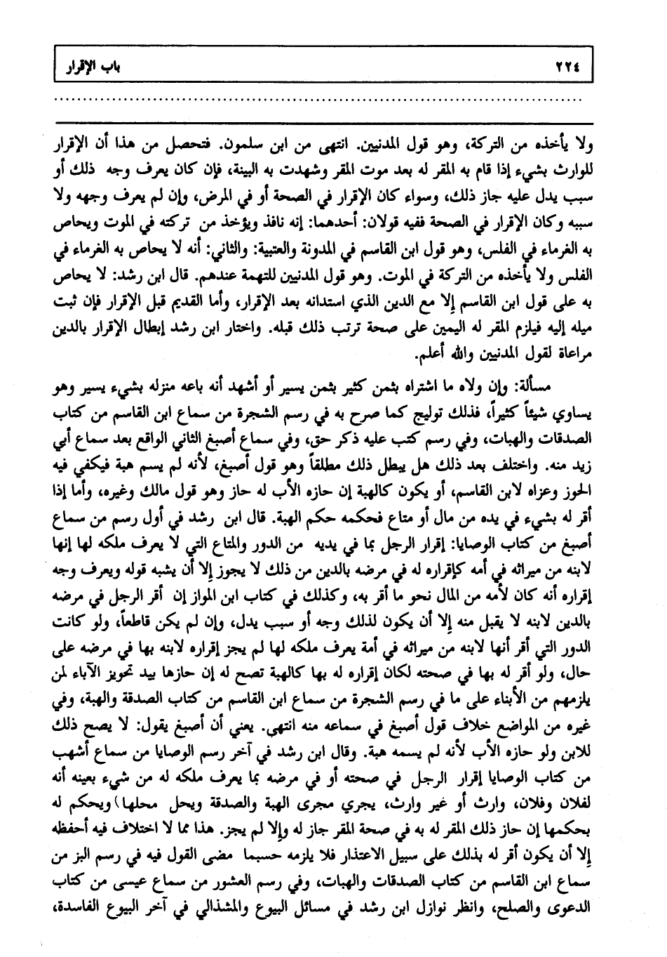 ولا يأخذه من التركة وهو قول المدنيين انتهى من ابن سلمون فتحصل من هذا أن الإقرار للوارث بشيء إذا قام به المقر له بعد موت المقر وشهدت به البينة فإن كان يعرف وجه ذلك أو سبب يدل عليه جاز ذلك وسواء كان الإقرار في الصحة أو في المرض وإن لم يعرف وجهه، ولا سببه وكان الإقرار في الصحة ففيه قولان: أحدهما: إنه نافذ ويؤخذ من تركته في الموت ويحاص به الغرماء في الفلس وهو قول ابن القاسم في المدونة والعتبية: والثاني: أنه لا يحاص به الغرماء في الفلس، ولا يأخذه من التركة في الموت وهو قول المدنيين للتهمة عندهم قال ابن رشد: لا يحاص به على قول ابن القاسم إلا مع الدين الذي استدانه بعد الإقرار، وأما القديم قبل الإقرار فإن ثبت ميله إليه، فيلزم المقر له اليمين على صحة ترتب ذلك قبله، واختار ابن رشد إبطال الإقرار بالدين مراعاة لقول المدنيين والله أعلم.