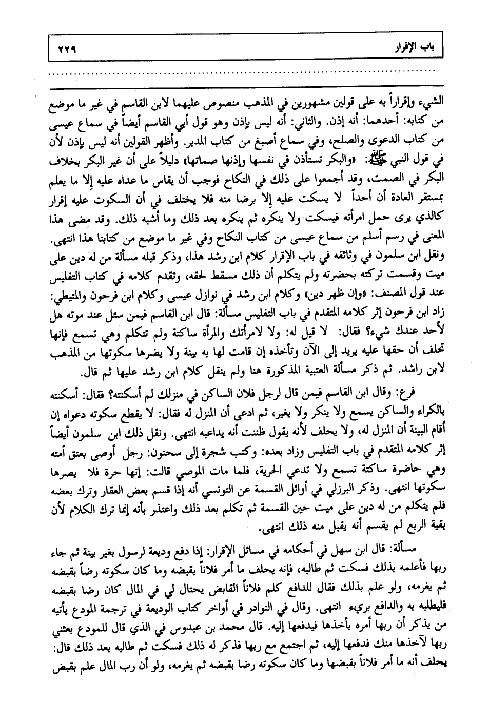 الشيء وإقرارا به على قولين مشهورين في المذهب منصوص عليهما لابن القاسم في غير ما موضع من كتابه. أحدهما: أنه إذن. والثاني: أنه ليس بإذن وهو قول أبي القاسم أيضا في سماع عيسى من كتاب الدعوى والصلح وفي سماع أصبغ من كتاب المدبر وأظهر القولين أنه ليس بإذن؛ لأن في قول النبي صلى الله عليه وسلم: "والبكر تستأذن في نفسها وإذنها صماتها" دليلا على أن غير البكر بخلاف البكر في الصمت، وقد أجمعوا على ذلك في النكاح، فوجب أن يقاس ما عداه عليه إلا ما يعلم بمستقر العادة أن أحدا لا يسكت عليه إلا برضا منه فلا يختلف في أن السكوت عليه إقرار كالذي يرى حمل امرأته فيسكت ولا ينكره، ثم ينكره بعد ذلك وما أشبه ذلك، وقد مضى هذا المعنى في رسم أسلم من سماع عيسى من كتاب النكاح وفي غير ما موضع من كتابنا هذا انتهى. ونقل ابن سلمون في وثائقه في باب الإقرار كلام ابن رشد هذا وذكر قبله مسألة من له دين على ميت وقسمت تركته بحضرته، ولم يتكلم أن ذلك مسقط لحقه، وتقدم كلامه في كتاب التفليس عند قول المصنف: "وإن ظهر دين" وكلام ابن رشد في نوازل عيسى وكلام ابن فرحون والمتيطي زاد ابن فرحون إثر كلامه المتقدم في باب التفليس مسألة قال ابن القاسم: فيمن سئل عند موته هل لأحد عندك شيء فقال لا قيل له ولا لامرأتك والمرأة ساكتة ولم تتكلم، وهي تسمع فإنها تحلف أن حقها عليه يريد إلى الآن، وتأخذه إن قامت لها به بينة، ولا يضرها سكوتها من المذهب لابن راشد، ثم ذكر مسألة العتبية المذكورة هنا، ولم ينقل كلام ابن رشد عليها، ثم قال:
