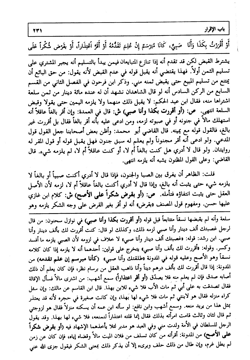 أو أقررت بكذا وأنا صبي، كانا مبرسم إن علم تقدمه أو أقر اعتذاراً، أو بقرض شكرا على