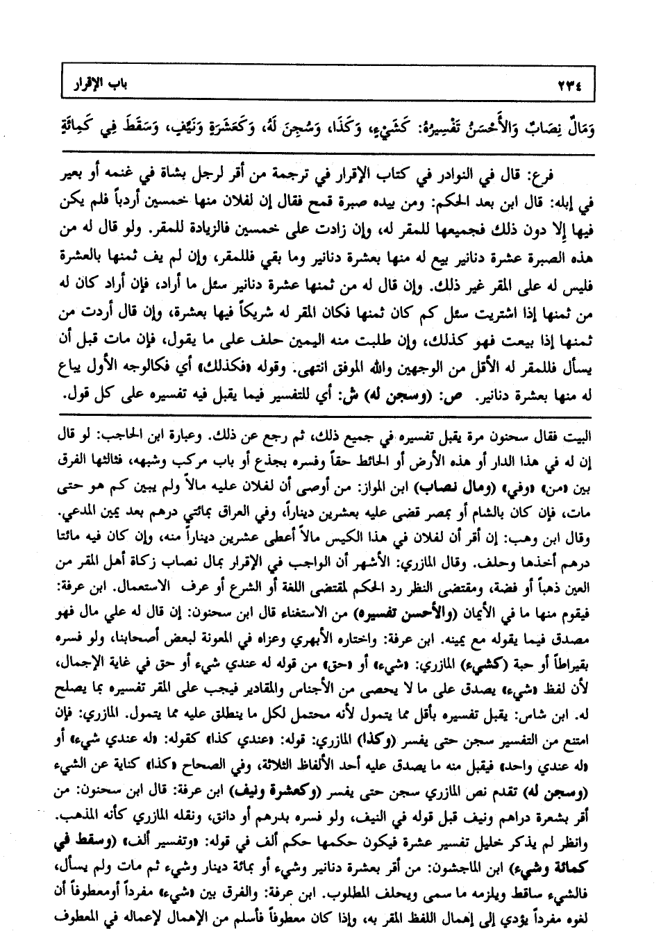 ومال نصاب والأحسن تفسيره: كشيء وكذا، وسجن له، وكعشرة ونيف، وسقط في كمائة