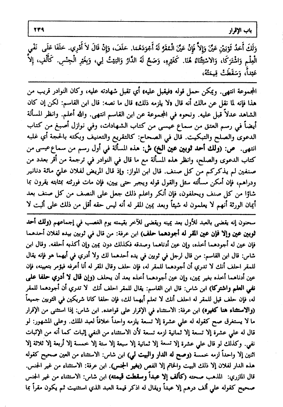 ولك أحد ثوبين عين وإلا فإن عين المقر له أجودهما. حلف، وإن قال لا أدري. حلفا على نفي العلم واشتركا، والاستثناء هنا. كغيره، وصح له الدار والبيت لي، وبغير الجنس. كألف، إلا عبدا، وسقطت قيمته،