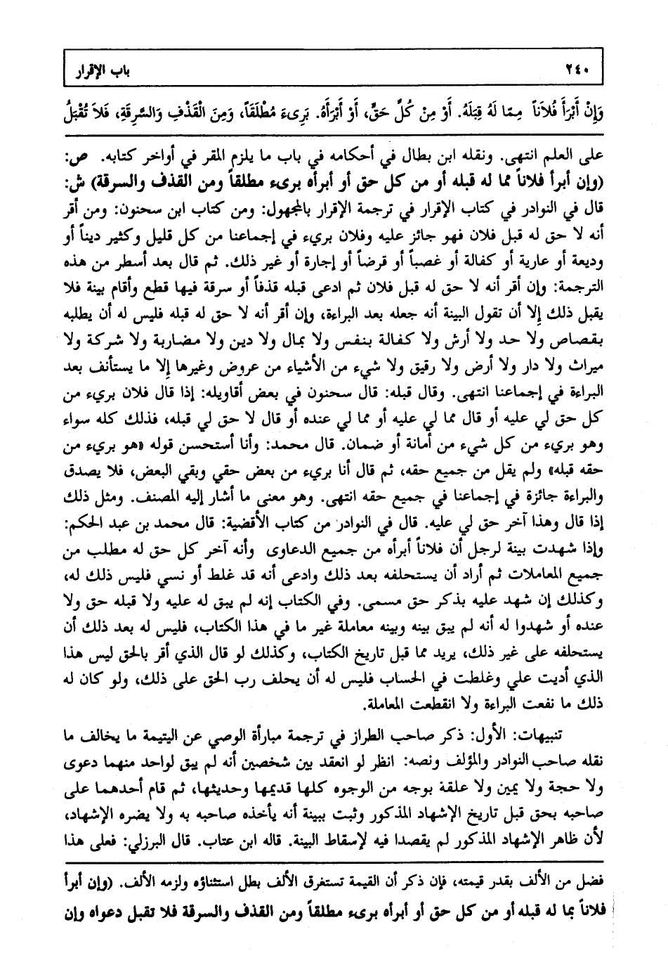 تنبيهات: الأول: ذكر صاحب الطراز في ترجمة مبارأة الوصي عن اليتيمة ما يخالف ما نقله صاحب النوادر والمؤلف ونصه انظر لو انعقد بين شخصين أنه لم يبق لواحد منهما دعوى ولا حجة ولا يمين ولا علقة بوجه من الوجوه كلها قديمها وحديثها، ثم قام أحدهما على صاحبه بحق قبل تاريخ الإشهاد المذكور، وثبت ببينة أنه يأخذه صاحبه به، ولا يضره الإشهاد؛ لأن ظاهر الإشهاد المذكور لم يقصدا فيه لإسقاط البينة قاله ابن عتاب قال البرزلي: فعلى هذا