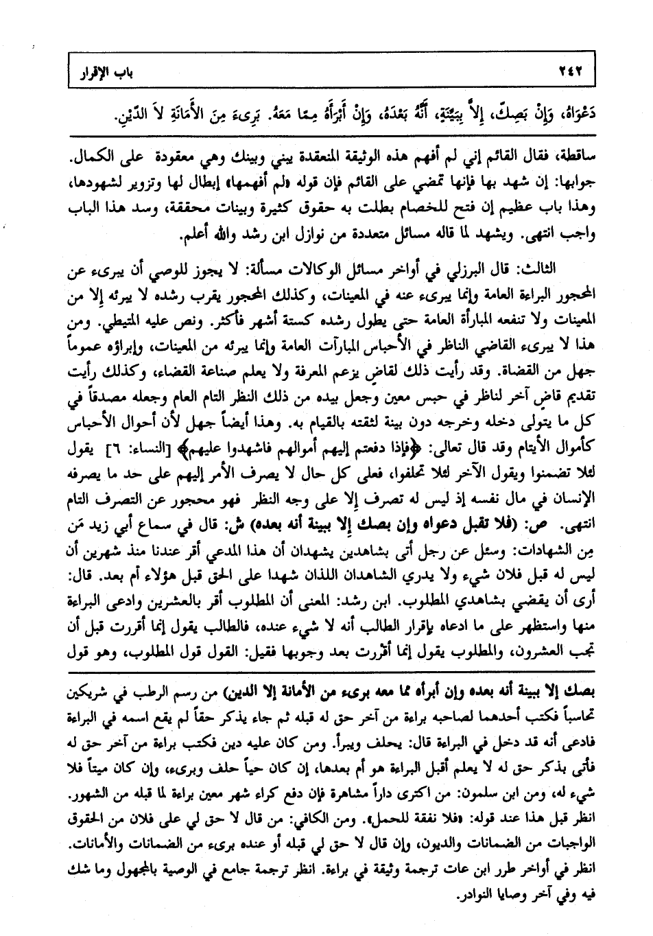 الثالث: قال البرزلي في أواخر مسائل الوكالات مسألة: لا يجوز للوصي أن يبرئ عن المحجور البراءة العامة، وإنما يبرئ عنه في المعينات، وكذلك المحجور يقرب رشده لا يبرئه إلا من المعينات، ولا تنفعه المبارأة العامة حتى يطول رشده كستة أشهر فأكثر ونص عليه المتيطي ومن هذا لا يبرئ القاضي الناظر في أحباس المبارآت العامة وإنما يبرئه من المعينات وإبراؤه عموما جهل من القضاة، وقد رأيت ذلك لقاض يزعم المعرفة، ولا يعلم صناعة القضاء، وكذلك رأيت تقديم قاض آخر لناظر في حبس معين، وجعل بيده من ذلك النظر التام العام وجعله مصدقا في كل ما يتولى دخله وخرجه دون بينة لثقته بالقيام به، وهذا أيضا جهل؛ لأن أحوال الأحباس كأموال الأيتام، وقد قال تعالى: {فَإِذَا دَفَعْتُمْ إِلَيْهِمْ أَمْوَالَهُمْ فَأَشْهِدُوا عَلَيْهِمْ} [النساء: 6] يقول لئلا تضمنوا ويقول الآخر لئلا تحلفوا فعلى كل حال لا يصرف الأمر إليهم على حد ما يصرفه الإنسان في مال نفسه إذ ليس له تصرف إلا على وجه النظر فهو محجور عن التصرف التام انتهى. ص: (فلا تقبل دعواه وإن بصك إلا ببينة أنه بعده) ش: قال في سماع أبي زيد من الشهادات وسئل عن رجل أتى بشاهدين يشهدان أن هذا المدعي أقر عندنا منذ شهرين أن ليس له قبل فلان شيء ولا يدري الشاهدان اللذان شهدا على الحق قبل هؤلاء أم بعد قال أرى أن يقضي بشاهدي المطلوب ابن رشد المعنى أن المطلوب أقر بالعشرين وادعى البراءة منها واستظهر على ما ادعاه بإقرار الطالب أنه لا شيء عنده، فالطالب يقول إنما أقررت قبل أن تجب العشرون والمطلوب يقول إنما أقررت بعد وجوبها فقيل القول قول المطلوب، وهو قول