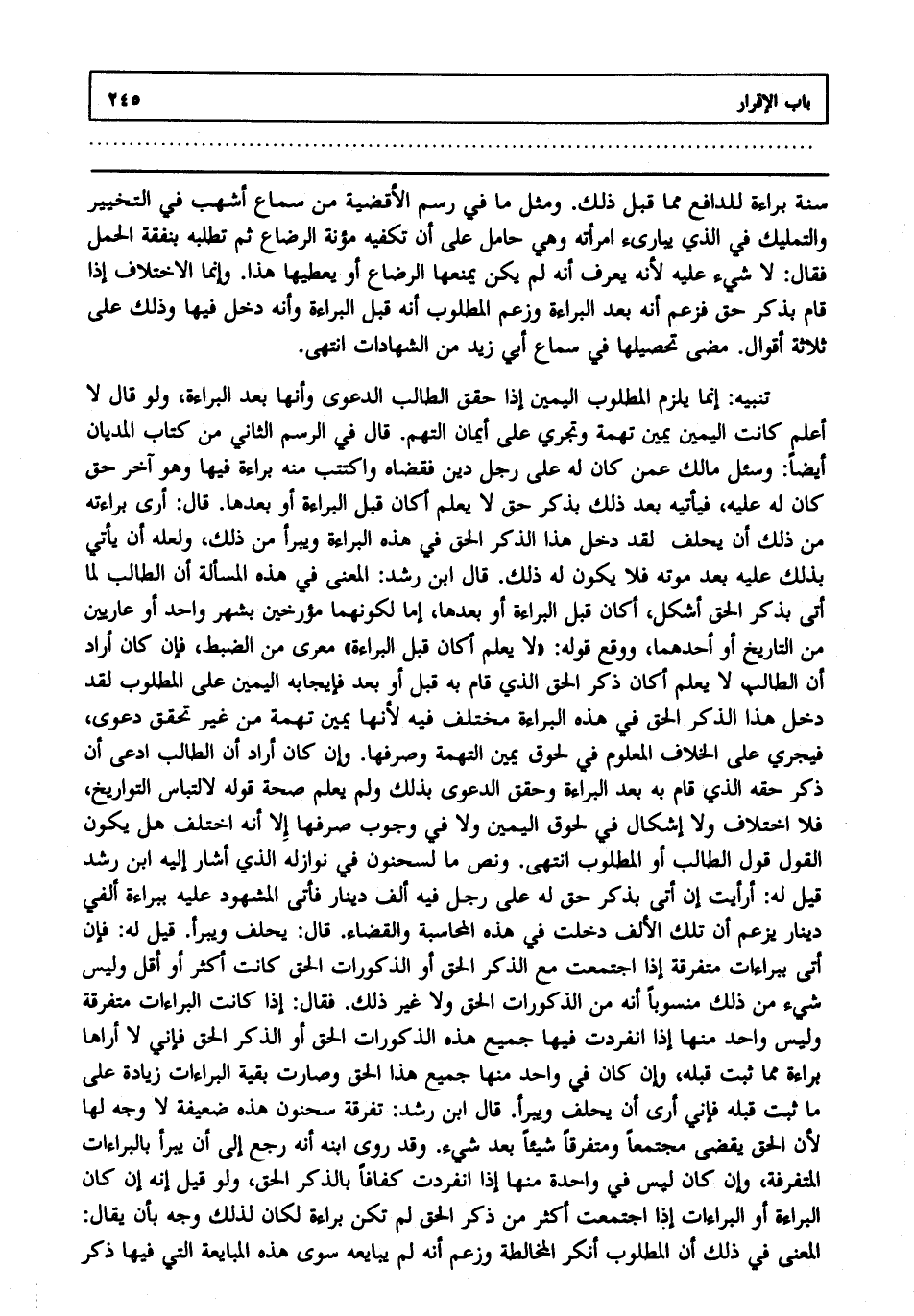 سنة براءة للدافع مما قبل ذلك، ومثل ما في رسم الأقضية من سماع أشهب في التخيير والتمليك في الذي يبارئ امرأته، وهي حامل على أن تكفيه مؤنة الرضاع، ثم تطلبه بنفقة الحمل فقال: لا شيء عليه؛ لأنه يعرف أنه لم يكن يمنعها الرضاع أو يعطيها هذا وإنما الاختلاف إذا قام بذكر حق، فزعم أنه بعد البراءة، وزعم المطلوب أنه قبل البراءة، وأنه دخل فيها، وذلك على ثلاثة أقوال مضى تحصيلها في سماع أبي زيد من الشهادات انتهى.