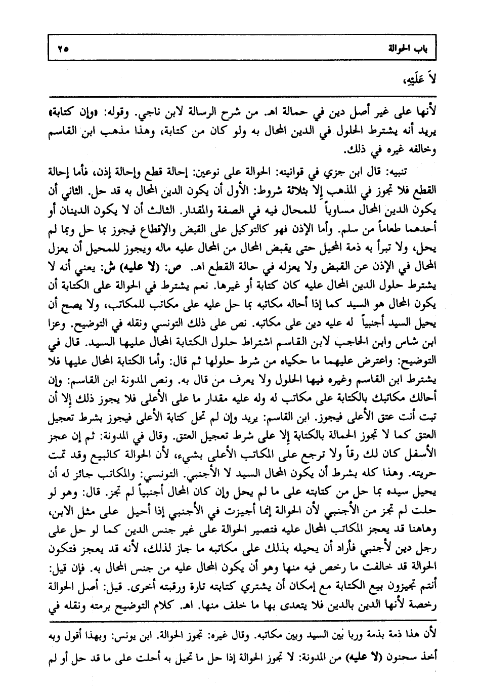 لأنها على غير أصل دين في حمالة ا هـ. من شرح الرسالة لابن ناجي، وقوله: وإن كتابة يريد أنه يشترط الحلول في الدين المحال به ولو كان من كتابة وهذا مذهب ابن القاسم وخالفه غيره في ذلك.