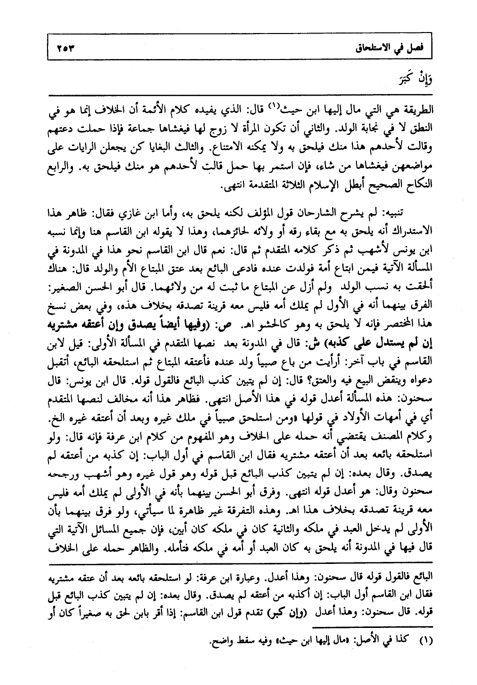 تنبيه: لم يشرح الشارحان قول المؤلف لكنه يلحق به، وأما ابن غازي فقال: ظاهر هذا الاستدراك أنه يلحق به مع بقاء رقه أو ولائه لحائزهما، وهذا لا يقوله ابن القاسم هنا، وإنما نسبه ابن يونس لأشهب، ثم ذكر كلامه المتقدم، ثم قال: نعم قال ابن القاسم: نحو هذا في المدونة في المسألة الآتية فيمن ابتاع أمة فولدت عنده، فادعى البائع بعد عتق المبتاع الأم والولد قال: هناك ألحقت به نسب الولد، ولم أزل عن المبتاع ما ثبت له من ولائهما قال أبو الحسن الصغير الفرق بينهما أنه في الأول لم يملك أمه، فليس معه قرينة تصدقه بخلاف هذه. وفي بعض نسخ هذا المختصر، فإنه لا يلحق به وهو كالحشو ا هـ. ص: (وفيها أيضا يصدق، وإن أعتقه مشتريه إن لم يستدل على كذبه) ش: قال في المدونة: بعد نصها المتقدم في المسألة الأولى قيل لابن القاسم في باب آخر أرأيت من باع صبيا ولد عنده، فأعتقه المبتاع، ثم استلحقه البائع أتقبل دعواه، وينقض البيع فيه، والعتق قال: إن لم يتبين كذب البائع فالقول قوله قال ابن يونس: قال سحنون: هذه المسألة أعدل قوله في هذا الأصل انتهى. فظاهر هذا أنه مخالف لنصها المتقدم أي في أمهات الأولاد في قولها:"ومن استلحق صبيا في ملك غيره وبعد أن أعتقه غيره" إلخ وكلام المصنف يقتضي أنه حمله على الخلاف، وهو المفهوم من كلام ابن عرفة، فإنه قال: ولو استلحقه بائعه بعد أن أعتقه مشتريه فقال ابن القاسم: في أول الباب إن كذبه من أعتقه لم يصدق، وقال بعده إن لم يتبين كذب البائع قبل قوله، وهو قول غيره، وهو أشهب ورجحه سحنون وقال هو أعدل قوله انتهى. وفرق أبو الحسن بينهما بأنه في الأولى لم يملك أمه فليس معه قرينة تصدقه بخلاف هذه ا هـ. وهذه التفرقة غير ظاهرة لما سيأتي، ولو فرق بينهما بأن الأولى لم يدخل العبد في ملكه، والثانية كان في ملكه كان أبين، فإن جميع المسائل الآتية التي قال فيها في المدونة: إنه يلحق به كان العبد أو أمه في ملكه، فتأمله والظاهر حمله على الخلاف،