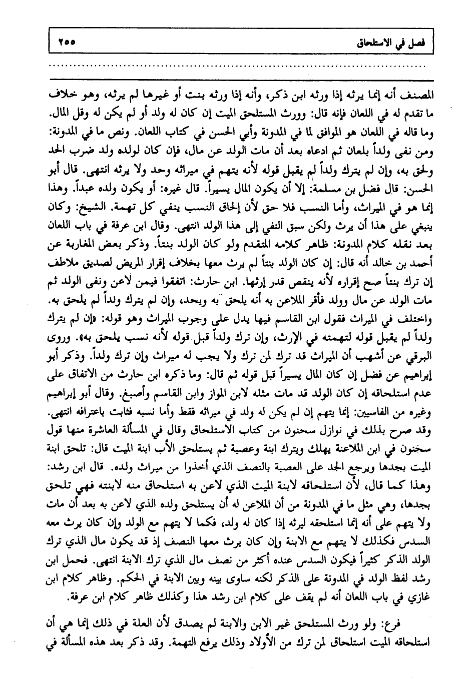 المصنف أنه إنما يرثه إذا ورثه ابن ذكر وأنه إذا ورثه بنت أو غيرها لم يرثه وهو خلاف ما تقدم له في اللعان، فإنه قال: وورث المستلحق الميت إن كان له ولد أو لم يكن له، وقل المال وما قاله في اللعان هو الموافق لما في المدونة وأبي الحسن في كتاب اللعان، ونص ما في المدونة ومن نفى ولدا بلعان، ثم ادعاه بعد أن مات الولد عن مال، فإن كان لولده ولد ضرب الحد ولحق به وإن لم يترك ولدا لم يقبل قوله؛ لأنه يتهم في ميراثه وحد ولا يرثه انتهى. قال أبو الحسن: قال فضل بن مسلمة: إلا أن يكون المال يسيرا قال غيره: أو يكون ولده عبدا، وهذا إنما هو في الميراث، وأما النسب فلا حق؛ لأن إلحاق النسب ينفي كل تهمة الشيخ وكان ينبغي على هذا أن يرث ولكن سبق النفي إلى هذا الولد انتهى. وقال ابن عرفة في باب اللعان بعد نقله كلام المدونة: ظاهر كلامه المتقدم، ولو كان الولد بنتا وذكر بعض المغاربة عن أحمد بن خالد أنه قال: إن كان الولد بنتا لم يرث معها بخلاف إقرار المريض لصديق ملاطف إن ترك بنتا صح إقراره؛ لأنه ينقص قدر إرثها ابن حارث اتفقوا فيمن لاعن، ونفى الولد، ثم مات الولد عن مال، وولد فأقر الملاعن به أنه يلحق به، ويحد، وإن لم يترك ولدا لم يلحق به، واختلف في الميراث فقول ابن القاسم فيها يدل على وجوب الميراث، وهو قوله: "إن لم يترك ولدا لم يقبل قوله لتهمته في الإرث، وإن ترك ولدا قبل قوله؛ لأنه نسب يلحق به". وروى البرقي عن أشهب أن الميراث قد ترك لمن ترك، ولا يجب له ميراث وإن ترك ولدا. وذكر أبو إبراهيم عن فضل إن كان المال يسيرا قبل قوله، ثم قال وما ذكره ابن حارث من الاتفاق على عدم استلحاقه إن كان الولد قد مات مثله لابن المواز وابن القاسم وأصبغ وقال أبو إبراهيم وغيره من الفاسيين: إنما يتهم إن لم يكن له ولد في ميراثه فقط، وأما نسبه، فثابت باعترافه انتهى، وقد صرح بذلك في نوازل سحنون من كتاب الاستلحاق وقال في المسألة العاشرة منها قول سحنون في ابن الملاعنة يهلك ويترك ابنة وعصبة، ثم يستلحق الأب ابنة الميت قال تلحق ابنة الميت بجدها ويرجع الجد على العصبة بالنصف الذي أخذوا من ميراث ولده قال ابن رشد: وهذا كما قال؛ لأن استلحاقه لابنة الميت الذي لاعن به استلحاق منه لابنته، فهي تلحق بجدها، وهي مثل ما في المدونة من أن الملاعن له أن يستلحق ولده الذي لاعن به بعد أن مات، ولا يتهم على أنه إنما استلحقه ليرثه إذا كان له ولد، فكما لا يتهم مع الولد، وإن كان يرث معه السدس، فكذلك لا يتهم مع الابنة، وإن كان يرث معها النصف إذ قد يكون مال الذي ترك الولد الذكر كثيرا، فيكون السدس عنده أكثر من نصف مال الذي ترك الابنة انتهى. فحمل ابن رشد لفظ الولد في المدونة على الذكر لكنه ساوى بينه وبين الابنة في الحكم وظاهر كلام ابن غازي في باب اللعان أنه لم يقف على كلام ابن رشد هذا، وكذلك ظاهر كلام ابن عرفة.