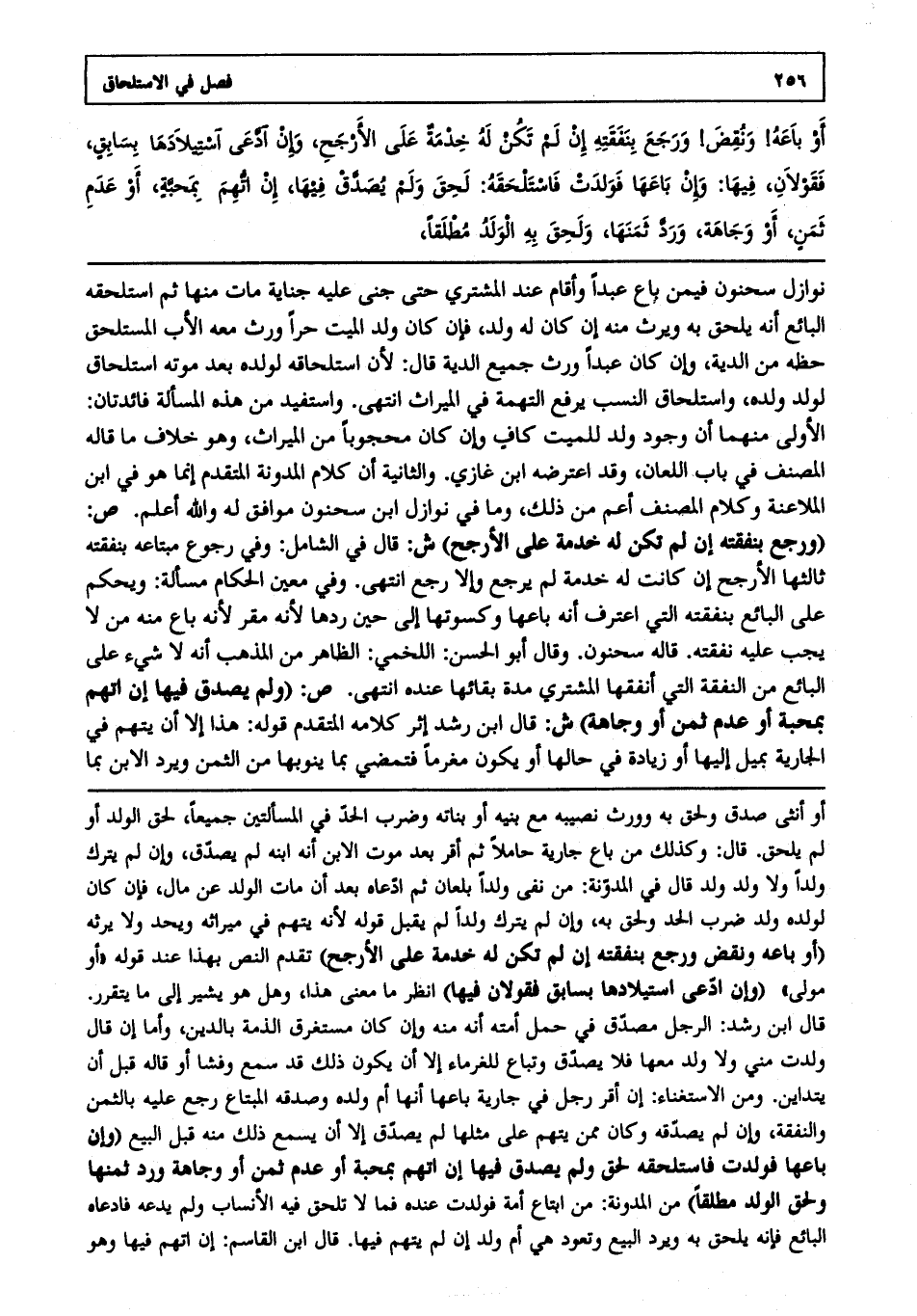 نوازل سحنون فيمن باع عبدا، وأقام عند المشتري حتى جنى عليه جناية مات منها، ثم استلحقه البائع أنه يلحق به، ويرث منه إن كان له ولد، فإن كان ولد الميت حرا ورث معه الأب المستلحق حظه من الدية، وإن كان عبدا ورث جميع الدية قال: لأن استلحاقه لولده بعد موته استلحاق لولد ولده واستلحاق النسب يرفع التهمة في الميراث انتهى. واستفيد من هذه المسألة فائدتان: الأولى: منهما أن وجود ولد للميت كاف، وإن كان محجوبا من الميراث وهو خلاف ما قاله المصنف في باب اللعان، وقد اعترضه ابن غازي والثانية أن كلام المدونة المتقدم إنما هو في ابن الملاعنة، وكلام المصنف أعم من ذلك وما في نوازل ابن سحنون موافق له والله أعلم. ص: (ورجع بنفقته إن لم تكن له خدمة على الأرجح) ش: قال في الشامل، وفي رجوع مبتاعه بنفقته ثالثها الأرجح إن كانت له خدمة لم يرجع، وإلا رجع انتهى. وفي معين الحكام مسألة ويحكم على البائع بنفقته التي اعترف أنه باعها وكسوتها إلى حين ردها؛ لأنه مقر أنه باع منه من لا يجب عليه نفقته قاله سحنون وقال أبو الحسن اللخمي: الظاهر من المذهب أنه لا شيء على البائع من النفقة التي أنفقها المشتري مدة بقائها عنده انتهى. ص: (ولم يصدق فيها إن اتهم بمحبة أو عدم ثمن أو وجاهة) ش: قال ابن رشد إثر كلامه المتقدم قوله هذا إلا أن يتهم في الجارية بميل إليها أو زيادة في حالها أو يكون مغرما، فتمضي بما ينوبها من الثمن، ويرد الابن بما