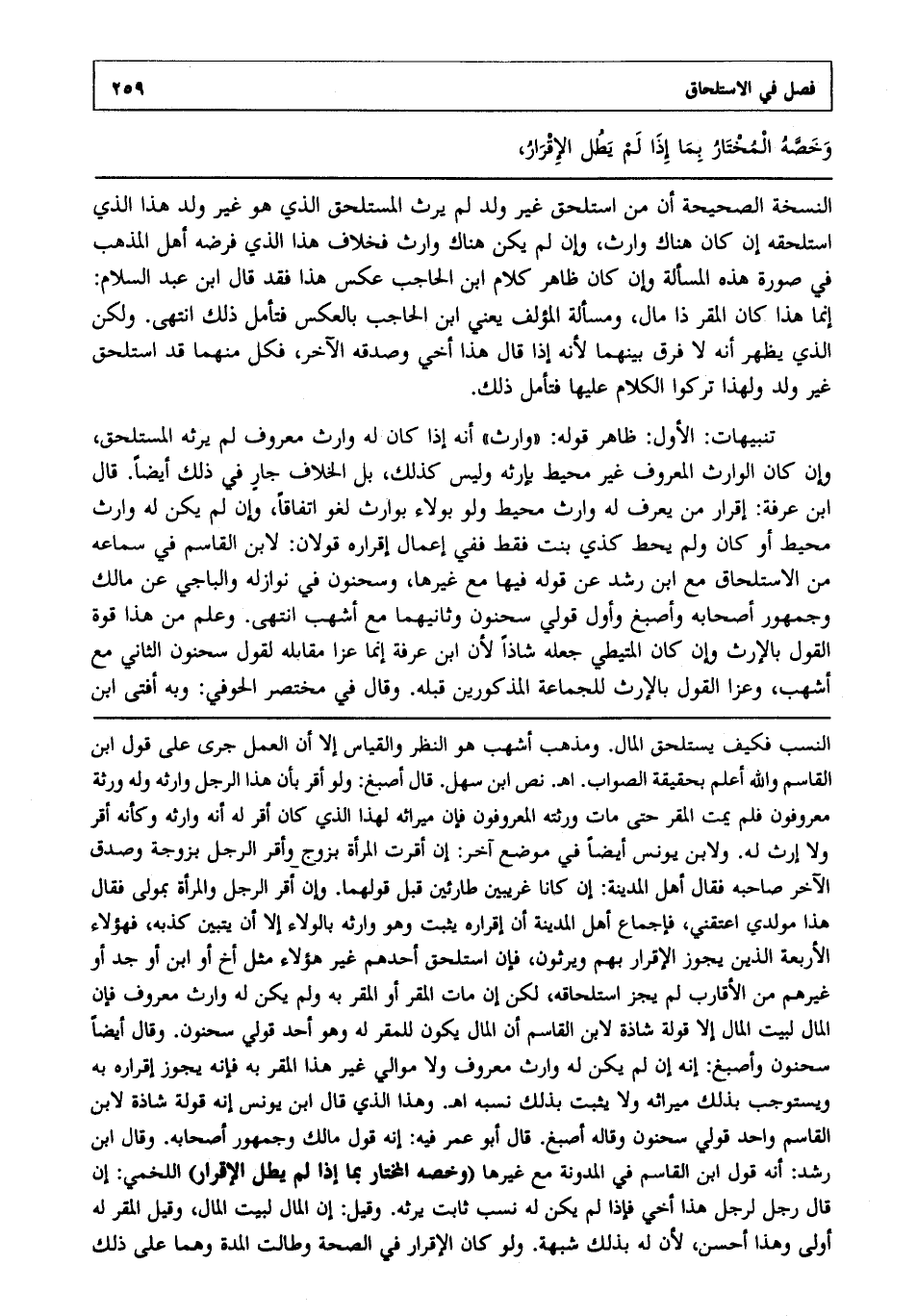 النّسخة الصّحيحة أنّ من استلحق غير ولد لم يرث المستلحق الّذي هو غير ولد هذا الّذي استلحقه إن كان هناك وارث وإن لم يكن هناك وارث، فخلاف هذا الّذي فرضه أهل المذهب في صورة هذه المسألة. وإن كان ظاهر كلام ابن الحاجب عكس هذا فقد قال ابن عبد السّلام: إنّما هذا إذا كان المقرّ ذا مال ومسألة المؤلّف يعني ابن الحاجب بالعكس فتأمّل ذلك انتهى، ولكنّ الّذي يظهر أنّه لا فرق بينهما؛ لأنّه إذا قال هذا أخي وصدّقه الآخر، فكلّ منهما قد استلحق غير ولد، ولهذا تركوا الكلام عليها، فتأمّل ذلك.