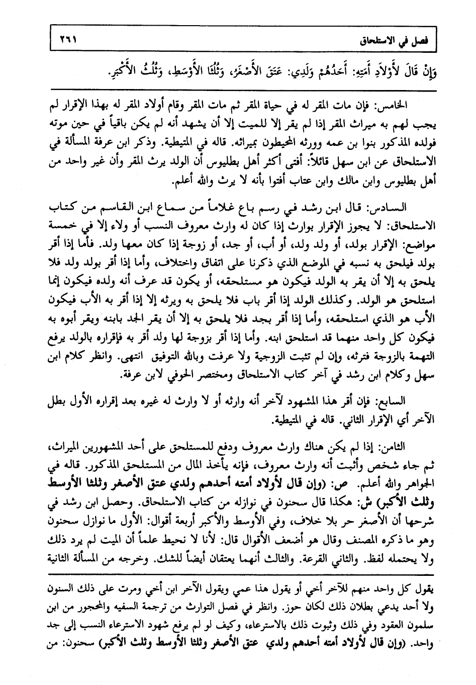 السّادس: قال ابن رشد في رسم باع غلاما من سماع ابن القاسم من كتاب الاستلحاق: لا يجوز الإقرار بوارث إذا كان له وارث معروف النّسب أو ولاء إلّا في خمسة مواضع الإقرار بولد أو ولد ولد أو أب أو جدّ أو زوجة إذا كان معها ولد فأمّا إذا أقرّ بولد، فيلحق به نسبه في الموضع الّذي ذكرنا على اتّفاق واختلاف، وأمّا إذا أقرّ بولد ولد، فلا يلحق به إلّا أن يقرّ به الولد، فيكون هو مستلحقه أو يكون قد عرف أنّه ولده، فيكون إنّما استلحق هو الولد، وكذلك الولد إذا أقرّ بأب فلا يلحق به، ويرثه إلّا إذا أقرّ به الأب، فيكون الأب هو الّذي استلحقه، وأمّا إذا أقرّ بجدّ فلا يلحق به إلّا أن يقرّ الجدّ بابنه، ويقرّ أبوه به فيكون كلّ واحد منهما قد استلحق ابنه، وأمّا إذا أقرّ بزوجة لها ولد أقرّ به فإقراره بالولد يرفع التّهمة بالزّوجة، فترثه وإن لم تثبت الزّوجيّة ولا عرفت وباللّه التّوفيق. انتهى. وانظر كلام ابن سهل وكلام ابن رشد في آخر كتاب الاستلحاق ومختصر الحوفيّ لابن عرفة.