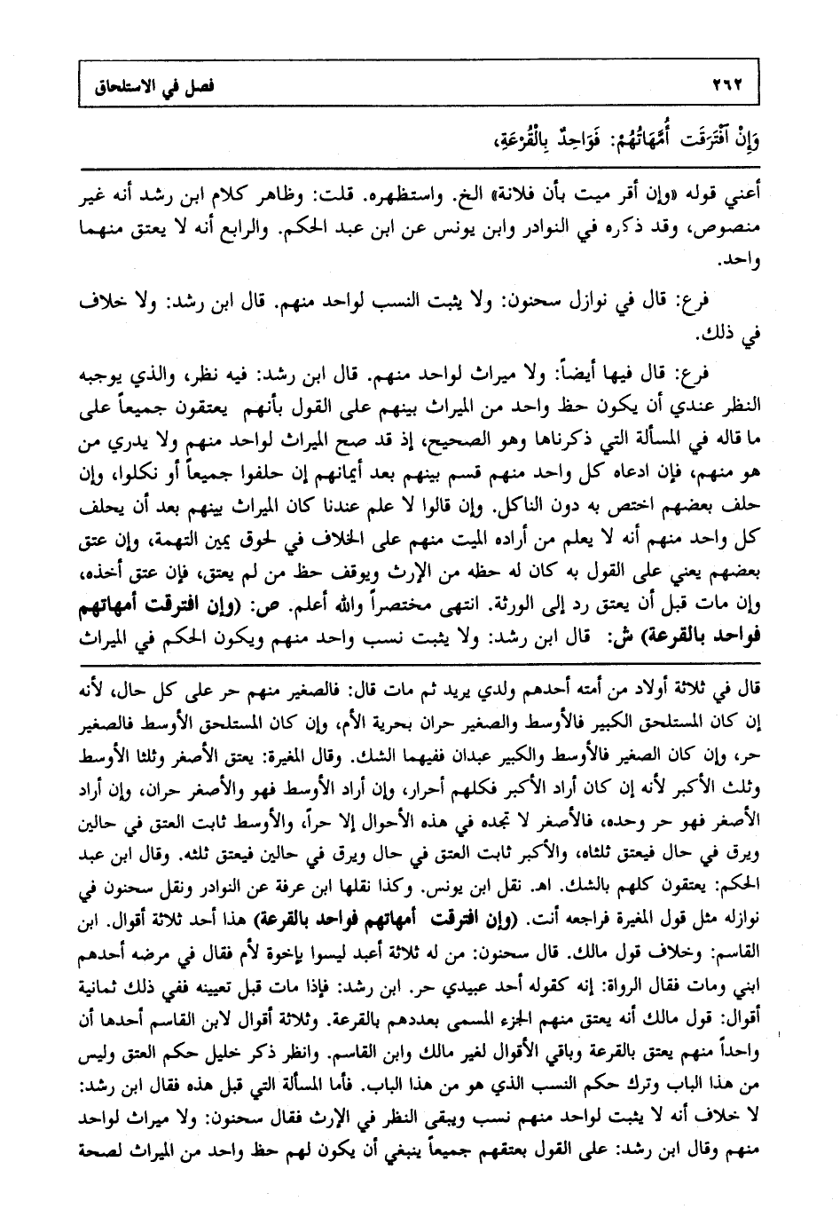 فرع: قال فيها أيضا: ولا ميراث لواحد منهم قال ابن رشد: فيه نظر والذي يوجبه النظر عندي أن يكون حظ واحد من الميراث بينهم على القول بأنهم يعتقون جميعا على ما قاله في المسألة التي ذكرناها، وهو الصحيح إذ قد صح الميراث لواحد منهم ولا يدري من هو منهم، فإن ادعاه كل واحد منهم قسم بينهم بعد أيمانهم إن حلفوا جميعا أو نكلوا، وإن حلف بعضهم اختص به دون الناكل، وإن قالوا: لا علم عندنا كان الميراث بينهم بعد أن يحلف كل واحد منهم أنه لا يعلم من أراده الميت منهم على الخلاف في لحوق يمين التهمة وإن عتق بعضهم يعني على القول به كان له حظه من الإرث، ويوقف حظ من لم يعتق، فإن عتق أخذه، وإن مات قبل أن يعتق رد إلى الورثة انتهى مختصرا والله أعلم. ص: (وإن افترقت أمهاتهم فواحد بالقرعة) ش: قال ابن رشد: ولا يثبت نسب واحد منهم، ويكون الحكم في الميراث