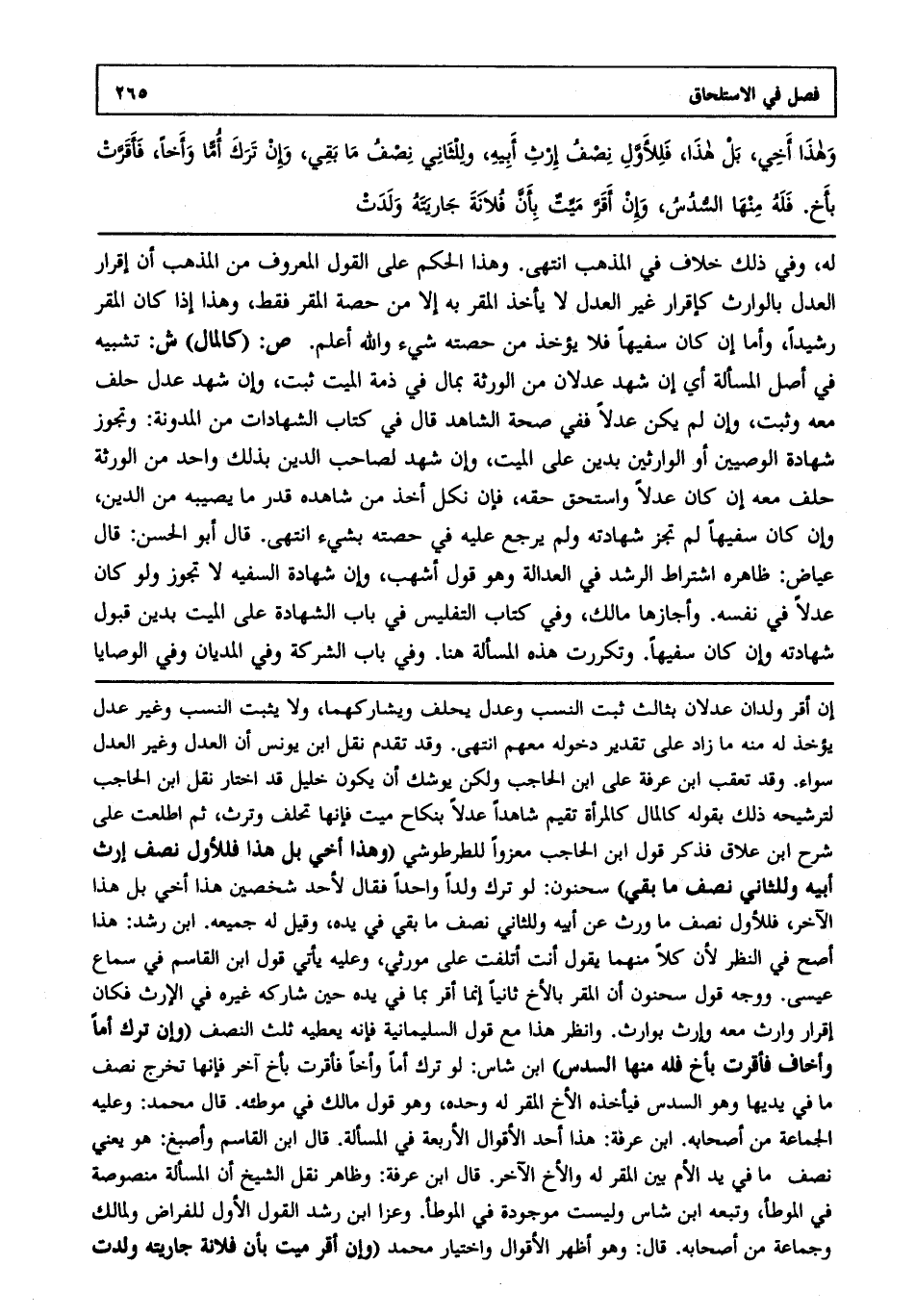 له، وفي ذلك خلاف في المذهب انتهى، وهذا الحكم على القول المعروف من المذهب أن إقرار العدل بالوارث كإقرار غير العدل لا يأخذ المقر به إلا من حصة المقر فقط وهذا إذا كان المقر رشيدا، وأما إن كان سفيها، فلا يؤخذ من حصته شيء والله أعلم. ص: (كالمال) ش: تشبيه في أصل المسألة أي إن شهد عدلان من الورثة بمال في ذمة الميت ثبت، وإن شهد عدل حلف معه، وثبت، وإن لم يكن عدلا ففي صحة الشاهد قال في كتاب الشهادات من المدونة: وتجوز شهادة الوصيين أو الوارثين بدين على الميت، وإن شهد لصاحب الدين بذلك واحد من الورثة حلف معه إن كان عدلا، واستحق حقه فإن نكل أخذ من شاهده قدر ما يصيبه من الدين، وإن كان سفيها لم تجز شهادته، ولم يرجع عليه في حصته بشيء انتهى. قال أبو الحسن: قال عياض: ظاهره اشتراط الرشد في العدالة، وهو قول أشهب وأن شهادة السفيه لا تجوز، ولو كان عدلا في نفسه، وأجازها مالك وفي كتاب التفليس في باب الشهادة على الميت بدين قبول شهادته، وإن كان سفيها وتكررت هذه المسألة هنا، وفي باب الشركة وفي المديان وفي الوصايا