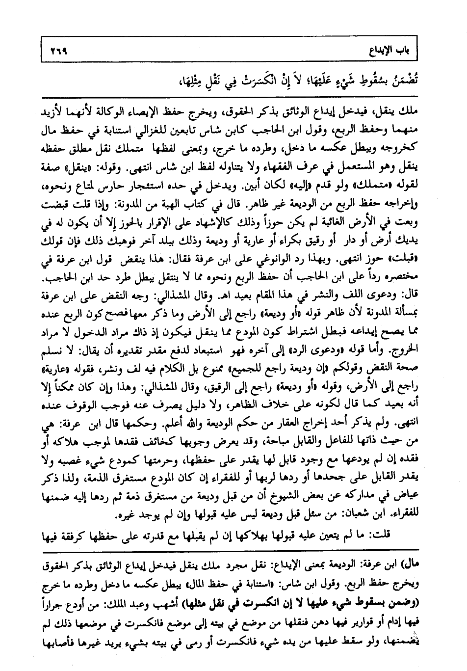 ملك ينقل، فيدخل إيداع الوثائق بذكر الحقوق ويخرج حفظ الإيصاء والوكالة؛ لأنهما لأزيد منهما وحفظ الربع وقول ابن الحاجب كابن شاس تابعين للغزالي استنابة في حفظ مال كخروجه ويبطل عكسه ما دخل وطرده ما خرج وبمعنى لفظها متملك: نقل مطلق حفظه، ينقل، وهو المستعمل في عرف الفقهاء ولا يتناوله لفظ ابن شاس انتهى. وقوله: "ينقل" صفة لقوله: "متملك" ولو قدم "إليه" لكان أبين. ويدخل في حده استئجار حارس لمتاع، ونحوه وإخراجه حفظ الربع من الوديعة غير ظاهر قال في كتاب الهبة من المدونة وإذا قلت قبضت وبعت في الأرض الغائبة لم يكن حوزا وذلك كالإشهاد على الإقرار بالحوز إلا أن يكون له في يديك أرض أو دار أو رقيق بكراء أو عارية أو وديعة، وذلك ببلد آخر فوهبك ذلك، فإن قولك قبلت حوز انتهى. وبهذا رد الوانوغي على ابن عرفة فقال هذا ينقض قول ابن عرفة في مختصره ردا على ابن الحاجب أن حفظ الربع ونحوه مما لا ينتقل يبطل طرد حد ابن الحاجب قال: ودعوى اللف والنشر في هذا المقام بعيد ا هـ. وقال المشذالي: وجه النقض على ابن عرفة بمسألة المدونة؛ لأن ظاهر قوله: "أو وديعة" راجع إلى الأرض وما ذكر معها فصح كون الربع عنده مما يصح إيداعه، فبطل اشتراط كون المودع مما ينقل، فيكون إذ ذاك مراد الدخول لا مراد الخروج، وأما قوله: "ودعوى الرد" إلى آخره، فهو استبعاد لدفع مقدر تقديره أن يقال لا نسلم صحة النقض، وقولكم: "إن وديعة راجع للجميع" ممنوع، بل الكلام فيه لف ونشر فقوله: "عارية" راجع إلى الأرض وقوله: "أو وديعة" راجع إلى الرقيق وقال المشذالي: وهذا، وإن كان ممكنا إلا أنه بعيد كما قال لكونه على خلاف الظاهر ولا دليل يصرف عنه، فوجب الوقوف عنده انتهى. ولم يذكر أحد إخراج العقار من حكم الوديعة والله أعلم وحكمها قال ابن عرفة: هي من حيث ذاتها للفاعل والقابل مباحة، وقد يعرض وجوبها كخائف فقدها لموجب هلاكه أو فقده إن لم يودعها مع وجود قابل لها يقدر على حفظها وحرمتها كمودع شيء غصبه، ولا يقدر القابل على جحدها أو ردها لربها أو للفقراء إن كان المودع مستغرق الذمة ولذا ذكر عياض في مداركه عن بعض الشيوخ أن من قبل وديعة من مستغرق ذمة، ثم ردها إليه ضمنها للفقراء ابن شعبان من سأل قبول وديعة ليس عليه قبولها، وإن لم يوجد غيره.
