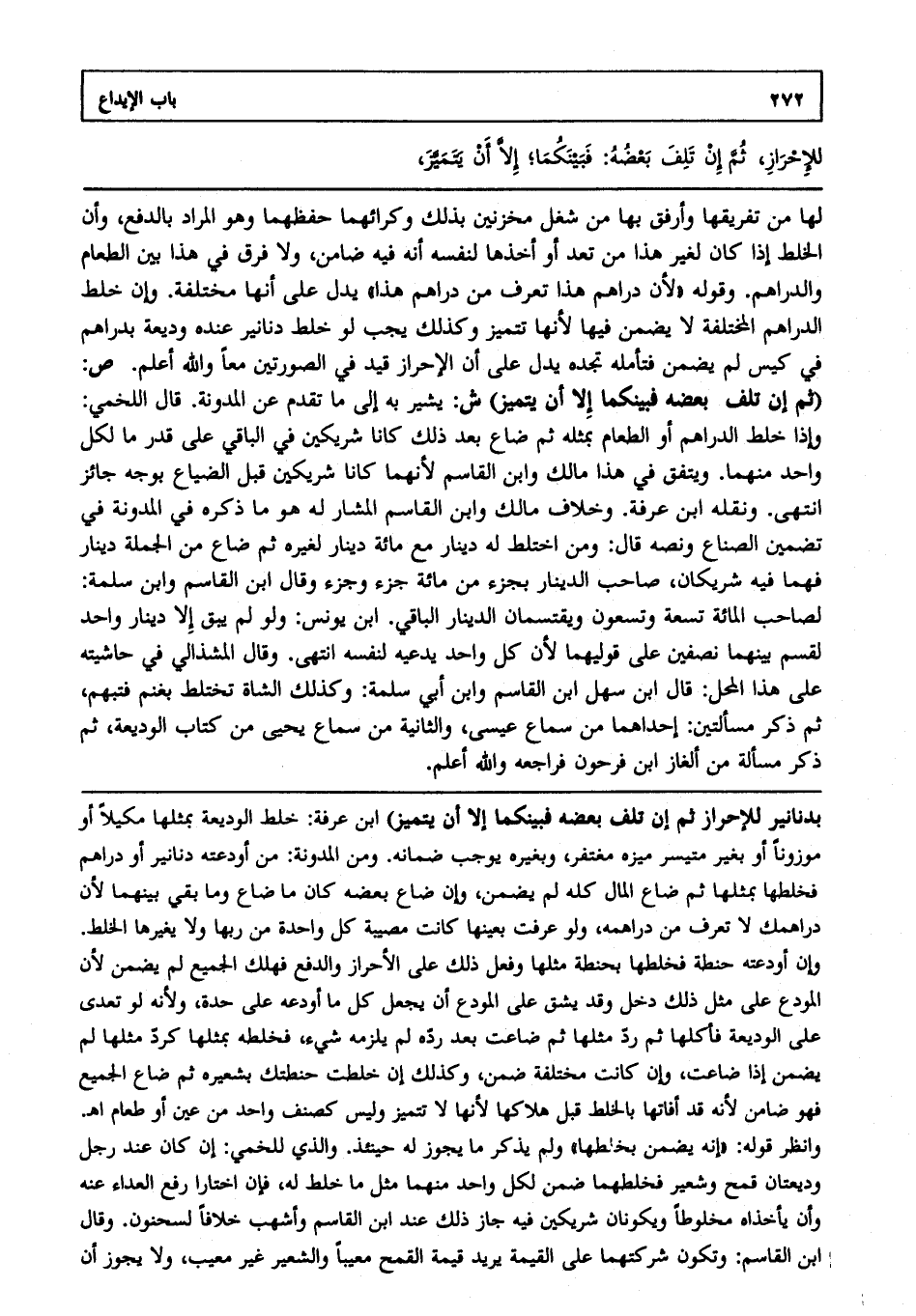 لها من تفريقها وأرفق بها من شغل مخزنين بذلك وكرائهما وحفظهما، وهو المراد بالدفع وإن الخلط إذا كان لغير هذا من تعد أو أخذها لنفسه أنه فيه ضامن، ولا فرق في هذا بين الطعام والدراهم، وقوله: "لأن دراهم هذا تعرف من دراهم هذا" يدل على أنها مختلفة، وإن خلط الدراهم المختلفة لا يضمن فيها؛ لأنها تتميز، وكذلك يجب لو خلط دنانير عنده وديعة بدراهم في كيس لم يضمن، فتأمله تجده يدل على أن الإحراز قيد في الصورتين معا والله أعلم. ص: (ثم إن تلف بعضه فبينكما إلا أن يتميز) ش: يشير به إلى ما تقدم عن المدونة قال اللخمي: وإذا خلط الدراهم أو الطعام بمثله، ثم ضاع بعد ذلك كانا شريكين في الباقي على قدر ما لكل واحد منهما، ويتفق في هذا مالك وابن القاسم؛ لأنهما كانا شريكين قبل الضياع بوجه جائز انتهى، ونقله ابن عرفة وخلاف مالك وابن القاسم المشار له هو ما ذكره في المدونة في تضمين الصناع ونصه قال ومن اختلط له دينار مع مائة دينار لغيره، ثم ضاع من الجملة دينار، فهما فيه شريكان صاحب الدينار بجزء من مائة جزء وجزء، وقال ابن القاسم وابن سلمة: لصاحب المائة تسعة وتسعون، ويقتسمان الدينار الباقي ابن يونس ولو لم يبق إلا دينار واحد لقسم بينهما نصفين على قوليهما؛ لأن كل واحد يدعيه لنفسه انتهى. وقال المشذالي في حاشيته على هذا المحل قال ابن سهل ابن القاسم وابن أبي سلمة: وكذلك الشاة تختلط بغنم فتبهم، ثم ذكر مسألتين إحداهما: من سماع عيسى والثانية من سماع يحيى من كتاب الوديعة، ثم ذكر مسألة من ألغاز ابن فرحون فراجعه والله أعلم.