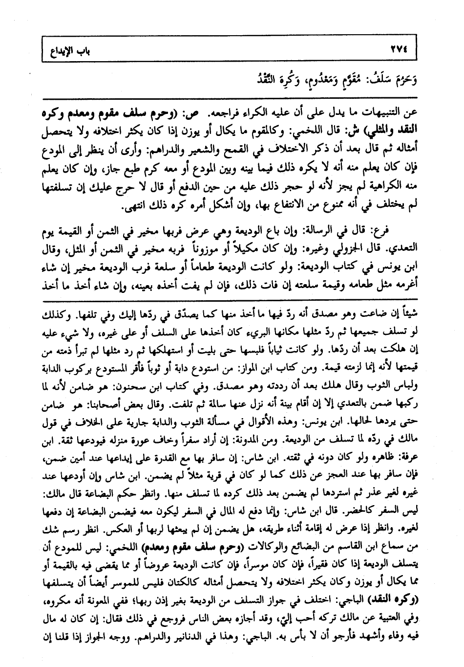عن التنبيهات ما يدل على أن عليه الكراء فراجعه. ص: (وحرم سلف مقوم ومعدم وكره النقد والمثلي) ش: قال اللخمي وكالمقوم ما يكال أو يوزن إذا كان يكثر اختلافه، ولا يتحصل أمثاله، ثم قال بعد أن ذكر الاختلاف في القمح والشعير والدراهم، وأرى أن ينظر إلى المودع فإن كان يعلم منه أنه لا يكره ذلك فيما بينه وبين المودع أو معه كرم طبع جاز، وإن كان يعلم منه الكراهية لم يجز؛ لأنه لو حجر ذلك عليه من حين الدفع أو قال لا حرج عليك إن تسلفتها لم يختلف في أنه ممنوع من الانتفاع بها، وإن أشكل أمره كره ذلك انتهى.