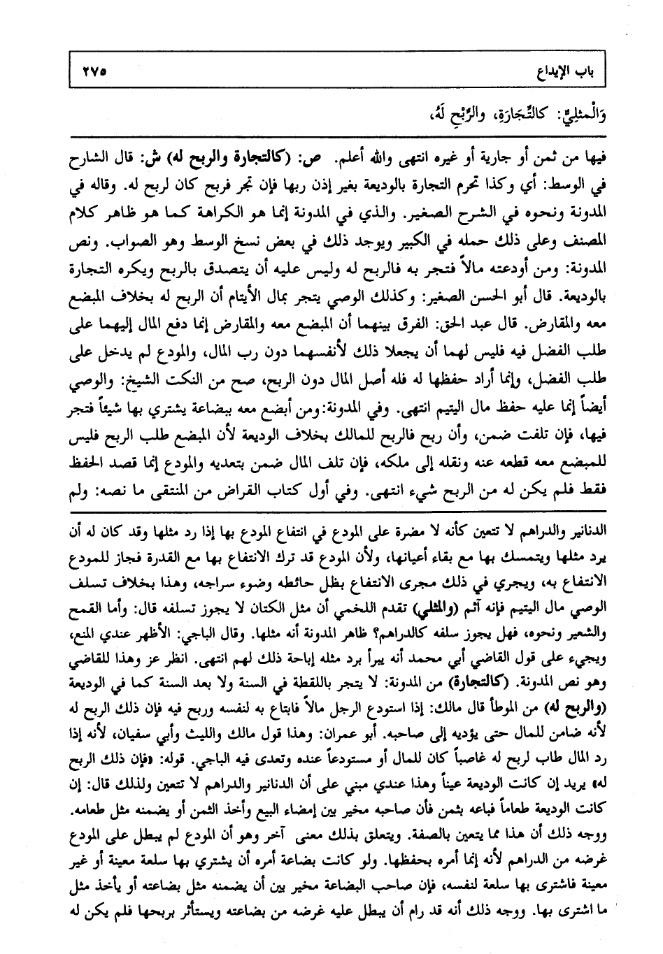 فيها من ثمن أو جارية أو غيره انتهى، والله أعلم. ص: (كالتجارة والربح له) ش: قال الشارح في الوسط: أي وكذا تحرم التجارة الوديعة بغير إذن ربها فإن تجر فربح كان الربح له. وقاله في المدونة ونحوه في الشرح الصغير والذي في المدونة إنما هو الكراهة كما هو ظاهر كلام المصنف وعلى ذلك حمله في الكبير ويوجد ذلك في بعض نسخ الوسط وهو الصواب ونص المدونة ومن أودعته مالا فتجر به فالربح له، وليس عليه أن يتصدق بالربح، ويكره التجارة الوديعة قال أبو الحسن الصغير: وكذلك الوصي يتجر بمال الأيتام إن الربح له بخلاف المبضع معه والمقارض قال عبد الحق: الفرق بينهما أن المبضع معه والمقارض إنما دفع المال إليهما على طلب الفضل فيه، فليس لهما أن يجعلا ذلك لأنفسهما دون رب المال والمودع لم يدخل على طلب الفضل، وإنما أراد حفظها له، فله أصل المال دون الربح صح من النكت الشيخ: والوصي أيضا إنما عليه حفظ مال اليتيم انتهى. وفي المدونة ومن أبضع معه ببضاعة يشتري بها شيئا، فتجر فيها، فإن تلفت ضمن، وإن ربح فالربح للمالك بخلاف الوديعة؛ لأن المبضع طلب الربح فليس للمبضع معه قطعه عنه ونقله إلى ملكه فإن تلف المال ضمن بتعديه والمودع إنما قصد الحفظ فقط فلم يكن له من الربح شيء انتهى. وفي أول كتاب القراض من المنتقى ما نصه: ولم