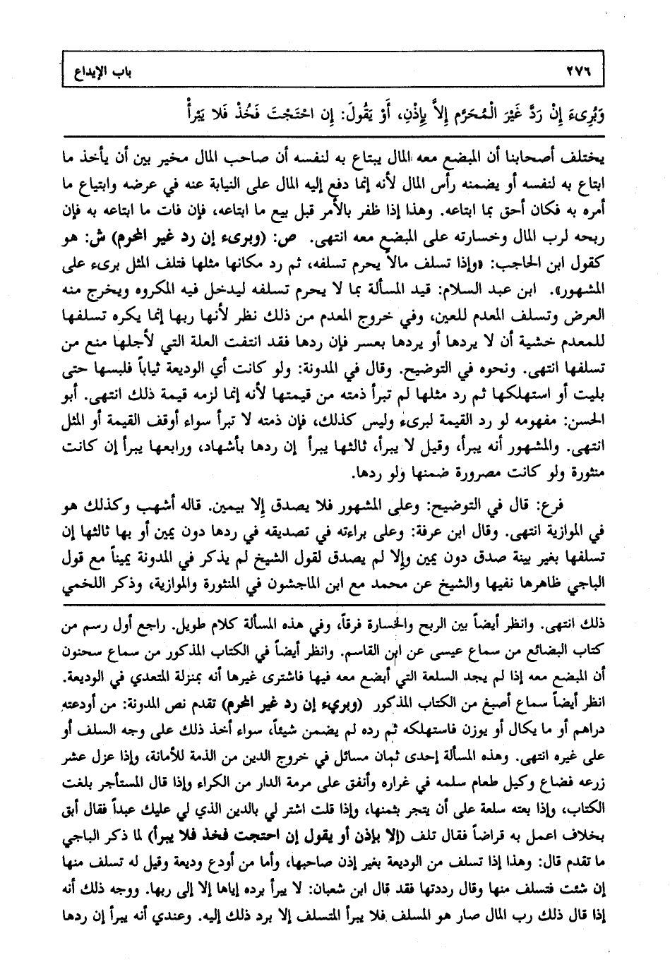 يختلف أصحابنا أن المبضع معه المال يبتاع به لنفسه أن صاحب المال مخير بين أن يأخذ ما ابتاع به لنفسه أو يضمنه رأس المال؛ لأنه إنما دفع إليه المال على النيابة عنه في عرضه وابتياع ما أمره به، فكان أحق بما ابتاعه، وهذا إذا ظفر بالأمر قبل بيع ما ابتاعه فإن فات ما ابتاعه به، فإن ربحه لرب المال وخسارته على المبضع معه انتهى. ص: (وبرئ إن رد غير المحرم) ش: هو كقول ابن الحاجب وإذا تسلف مالا يحرم تسلفه، ثم رد مكانها مثلها، فتلف المثل برئ على المشهور ابن عبد السلام قيد المسألة بما لا يحرم تسلفه ليدخل فيه المكروه، ويخرج منه العرض، وتسلف المعدم للعين، وفي خروج المعدم من ذلك نظر؛ لأن ربها إنما يكره تسلفها للمعدم خشية أن لا يردها أو يردها بعسر فإن ردها، فقد انتفت العلة التي لأجلها منع من تسلفها انتهى. ونحوه في التوضيح وقال في المدونة ولو كانت أي الوديعة ثيابا فلبسها حتى بليت أو استهلكها، ثم رد مثلها لم تبرأ ذمته من قيمتها؛ لأنه إنما لزمه قيمة ذلك انتهى. أبو الحسن مفهومه لو رد القيمة لبرئ، وليس كذلك، فإن ذمته لا تبرأ سواء أوقف القيمة أو المثل انتهى، والمشهور أنه يبرأ، وقيل لا يبرأ ثالثها: يبرأ إن ردها بإشهاد ورابعها: يبرأ إن كانت منثورة ولو كانت مصرورة ضمنها ولو ردها.