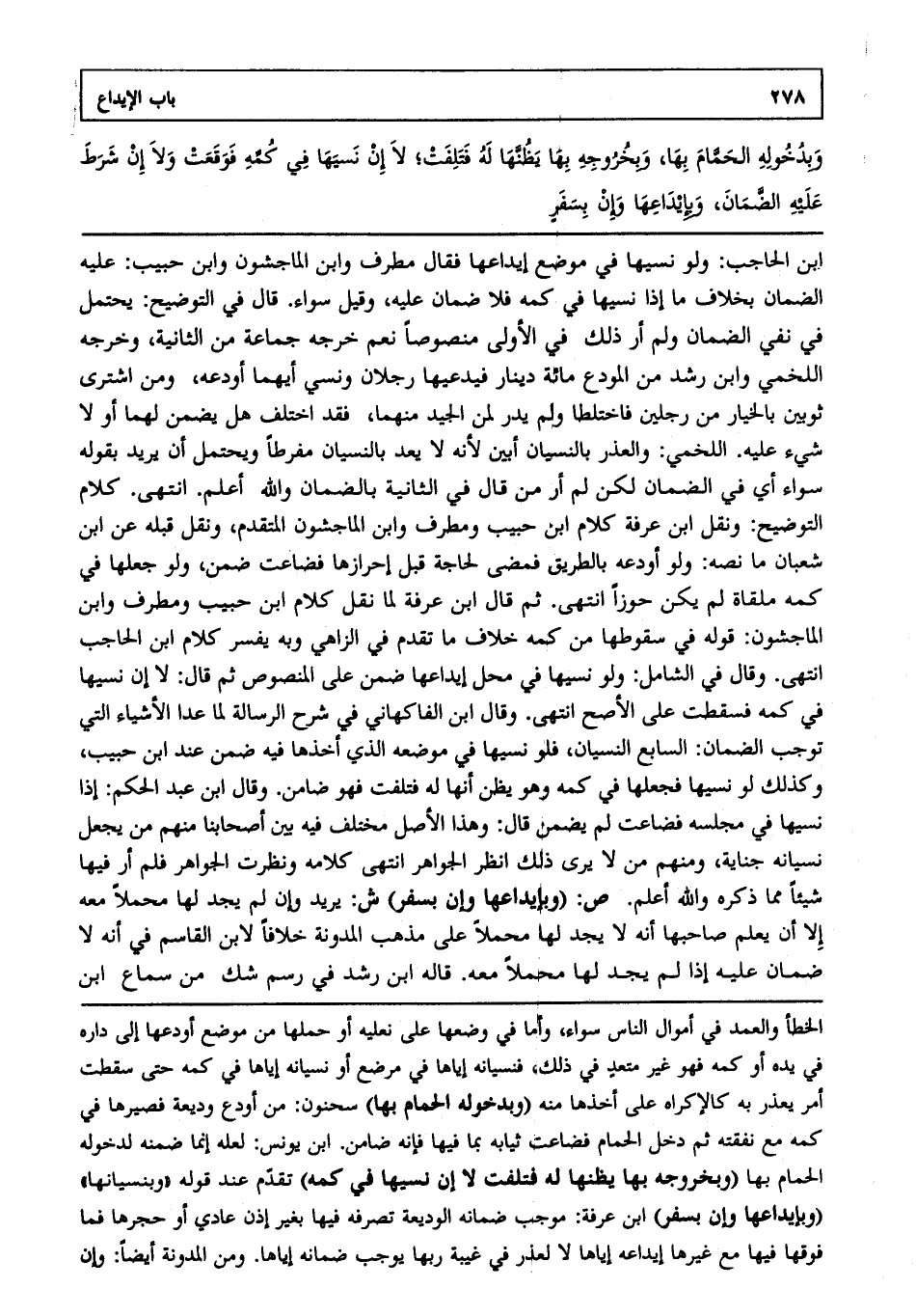 ابن الحاجب: ولو نسيها في موضع إيداعها، فقال مطرف وابن الماجشون وابن حبيب عليه الضمان بخلاف ما إذا نسيها في كمه، فلا ضمان عليه وقيل سواء قال في التوضيح: يحتمل في نفي الضمان، ولم أر ذلك في الأولى منصوصا نعم خرجه جماعة من الثانية، وخرجه اللخمي وابن رشد من المودع مائة دينار، فيدعيها رجلان، ونسي أيهما أودعه، ومن اشترى ثوبين بالخيار من رجلين، فاختلطا، ولم يدر لمن الجيد منهما، فقد اختلف هل يضمن لهما أو لا شيء عليه؟ اللخمي والعذر بالنسيان أبين؛ لأنه لا يعد بالنسيان مفرطا، ويحتمل أن يريد بقوله سواء أي في الضمان لكن لم أر من قال في الثانية بالضمان والله أعلم. انتهى كلام التوضيح. ونقل ابن عرفة كلام ابن حبيب ومطرف وابن الماجشون المتقدم، ونقل قبله عن ابن شعبان ما نصه، ولو أودعه بالطريق فمضى لحاجة قبل إحرازها، فضاعت ضمن ولو جعلها في كمه ملقاة لم يكن حوزا انتهى. ثم قال ابن عرفة: لما نقل كلام ابن حبيب ومطرف وابن الماجشون قوله في سقوطها من كمه خلاف ما تقدم في الزاهي وبه يفسر كلام ابن الحاجب انتهى. وقال في الشامل ولو نسيها في محل إيداعها ضمن على المنصوص، ثم قال: لا إن نسيها في كمه، فسقطت على الأصح انتهى وقال ابن الفاكهاني في شرح الرسالة: لما عد الأشياء التي توجب الضمان، السابع: النسيان فلو نسيها في موضعه الذي أخذها فيه ضمن عند ابن حبيب، وكذلك لو نسيها، فجعلها في كمه، وهو يظن أنها له، فتلفت، فهو ضامن وقال ابن عبد الحكم: إذا نسيها في مجلسه، فضاعت لم يضمن قال: وهذا الأصل مختلف فيه بين أصحابنا منهم من يجعل نسيانه جناية، ومنهم من لا يرى ذلك انظر الجواهر انتهى كلامه ونظرت الجواهر فلم أر فيها شيئا مما ذكره والله أعلم. ص: (وبإيداعها وإن بسفر) ش: يريد وإن لم يجد لها محملا معه إلا أن يعلم صاحبها أنه لا يجد لها محملا على مذهب المدونة خلافا لابن القاسم في أنه لا ضمان عليه إذا لم يجد لها محملا معه قاله ابن رشد في رسم شك من سماع ابن