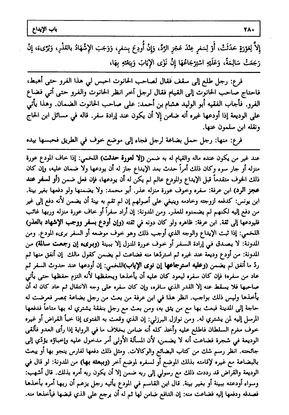 فرع: رجل طلع إلى سقف، فقال لصاحب الحانوت: احبس لي هذا الفرو حتى أهبط، فاحتاج صاحب الحانوت إلى القيام، فقال لرجل آخر انظر الحانوت والفرو حتى آتي فضاع الفرو فأجاب الفقيه أبو الوليد هشام بن أحمد على صاحب الحانوت الضمان، وهذا يأتي على الوديعة إذا أودعها غيره أنه ضامن إلا أن يكون عند إرادة سفر قاله في مسائل ابن الحاج، ونقله ابن سلمون عنها.