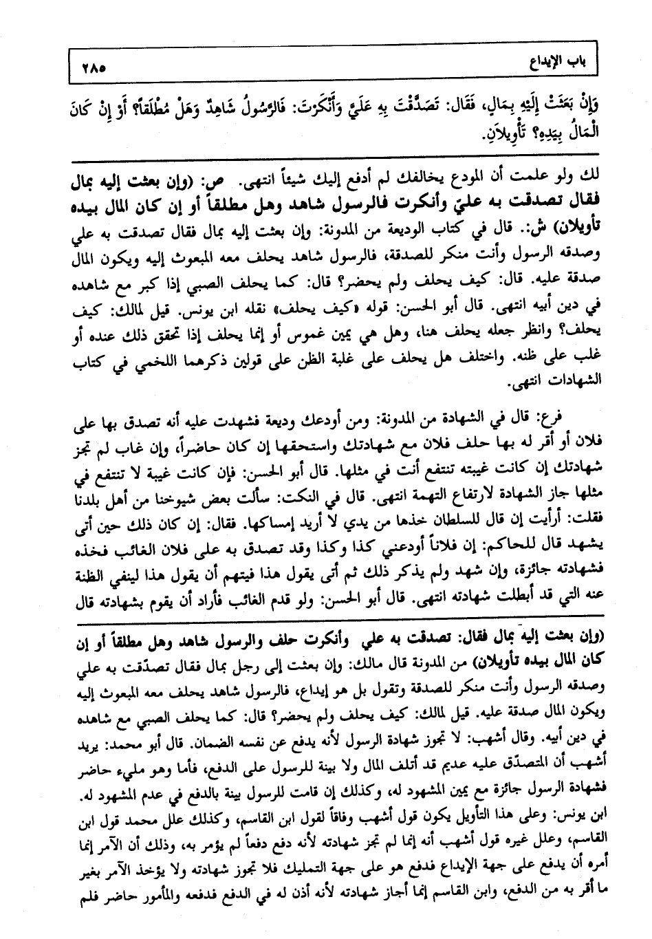 وإن بعثت إليه بمال، فقال: تصدقت به علي وأنكرت: فالرسول شاهد وهل مطلقا؟ أو إن كان المال بيده؟ تأويلان.