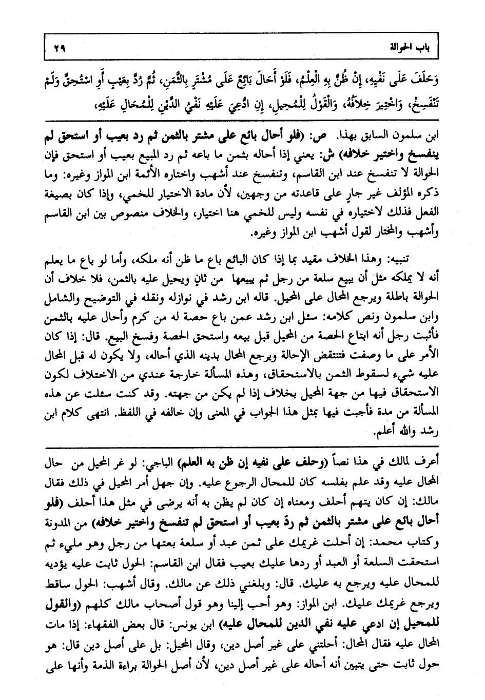 ابن سلمون السابق بهذا. ص: (فلو أحال بائع على مشتر بالثمن، ثم رد بعيب أو استحق لم ينفسخ واختير خلافه) ش: يعني إذا أحاله بثمن ما باعه، ثم رد المبيع بعيب أو استحق فإن الحوالة لا تنفسخ عند ابن القاسم وتنفسخ عند أشهب واختاره الأئمة ابن المواز وغيره وما ذكره المؤلف غير جار على قاعدته من وجهين، لأن مادة الاختيار للخمي وإذا كان بصيغة الفعل فذلك لاختياره في نفسه وليس للخمي هنا اختيار، والخلاف منصوص بين ابن القاسم وأشهب والمختار لقول أشهب ابن المواز وغيره.