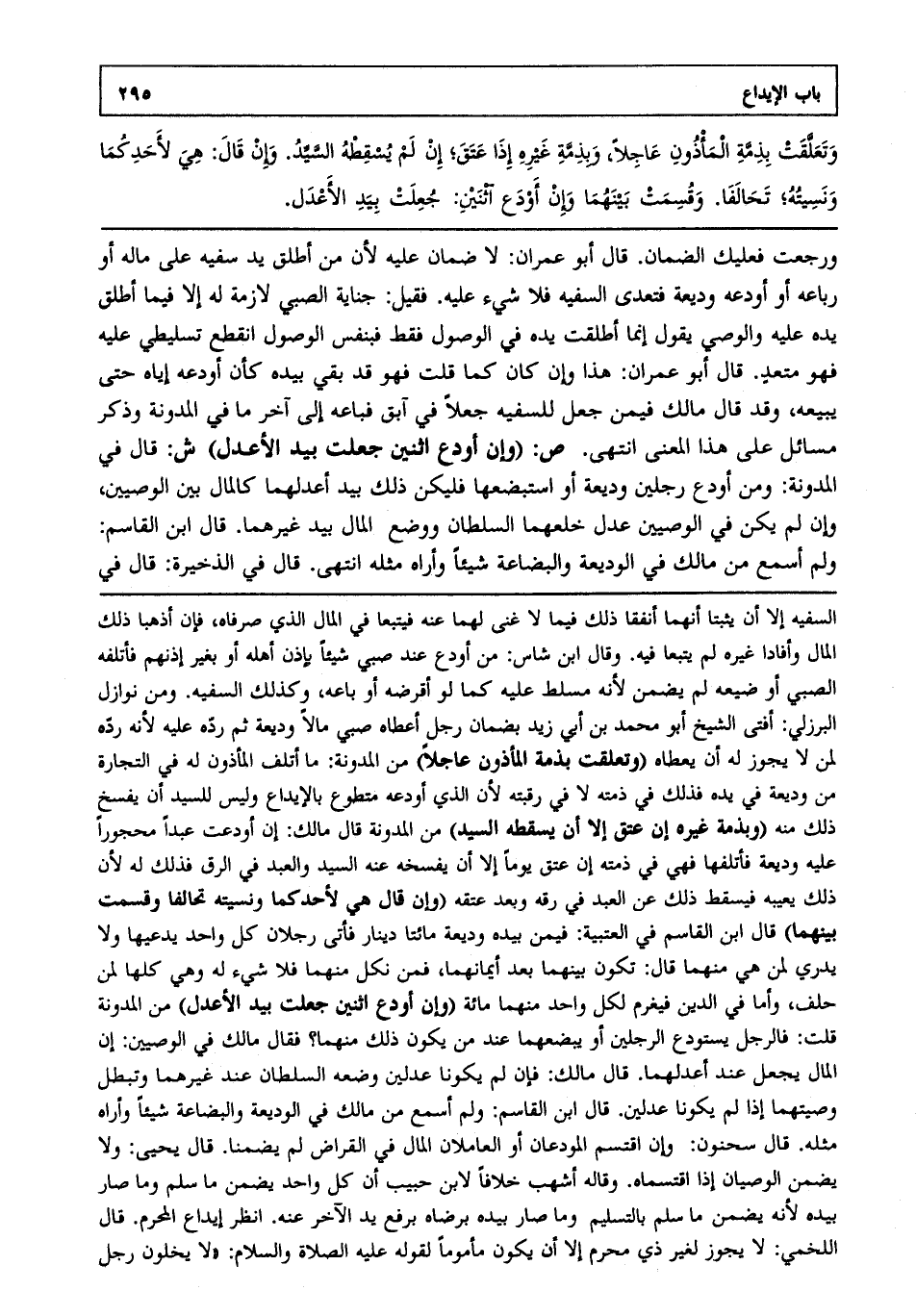 ورجعت، فعليك الضمان. قال أبو عمران: لا ضمان عليه؛ لأن من أطلق يد سفيه على ماله أو رباعه أو أودعه وديعة فتعدى السفيه، فلا شيء عليه، فقيل جناية الصبي لازمة له إلا فيما أطلق يده عليه، والوصي يقول: إنما أطلقت يده في الوصول فقط، فبنفس الوصول انقطع تسليطي عليه، فهو متعد قال أبو عمران: هذا وإن كان كما قلت، فهو قد بقي بيده كأن أودعه إياه حتى يبيعه وقد قال مالك: فيمن جعل للسفيه جعلا في آبق، فباعه إلى آخر ما في المدونة، وذكر مسائل على هذا المعنى انتهى. ص: (وإن أودع اثنين جعلت بيد الأعدل) ش: قال في المدونة ومن أودع رجلين وديعة أو استبضعها، فليكن ذلك بيد أعدلهما كالمال بين الوصيين، وإن لم يكن في الوصيين عدل خلعهما السلطان ووضع المال بيد غيرهما قال ابن القاسم: ولم أسمع من مالك في الوديعة والبضاعة شيئا وأراه مثله انتهى قال في الذخيرة: قال في