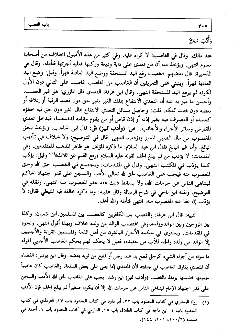 عند مالك وقال في الغاصب: لا كراء عليه وفي كثير من هذه الأصول اختلاف من أصحابنا معلوم، انتهى. ويؤخذ منه أن من تعدى على دابة وديعة وركبها فعليه أجرتها فتأمله وقال في الذخيرة: قال بعضهم الغصب رفع اليد المستحقة ووضع اليد العادية قهرا وقيل: وضع اليد العادية قهرا وينبني على التعريفين أن الغاصب من الغاصب غاصب على الثاني دون الأول؛ لكونه لم يرفع اليد المستحقة، انتهى. وقال ابن عرفة: التعدي قال المازري: هو غير الغصب وأحسن ما ميز به عنه أن التعدي الانتفاع بملك الغير بغير حق دون قصد الرقبة أو إتلافه أو بعضه دون قصد تملكه. قلت: وحاصل مسائل التعدي الانتفاع بمال الغير دون حق فيه خطؤه كعمده أو التصرف فيه بغير إذنه أو إذن قاض أو من يقوم مقامه لفقدهما فيدخل تعدي المقارض وسائر الأجراء والأجانب. ص: (وأدب مميز) ش: قال ابن الحاجب: ويؤخذ بحق المغصوب من مال الصبي المميز ويؤدب، انتهى. قال في التوضيح: ولا خلاف في تأديب البالغ وأما غير البالغ فقال ابن عبد السلام: ما ذكره المؤلف هو ظاهر المذهب للمتقدمين وفي المقدمات لا يؤدب من لم يبلغ الحلم لقوله عليه السلام: "رفع القلم عن ثلاث" 1. وقيل: يؤدب كما يؤدب في المكتب انتهى. وقال في المقدمات: ويجتمع في الغصب حق الله وحق المغصوب منه فيجب على الغاصب لحق لله تعالى الأدب والسجن على قدر اجتهاد الحاكم ليتناهى الناس عن حرمات الله ولا يسقط ذلك عنه عفو المغصوب منه، انتهى. ونقله في التوضيح ونقله ابن ناجي في شرح الرسالة وقال عقيبه: وما ذكره خالفه فيه المتيطي فقال: لا يؤدب إن عفا عنه المغصوب منه، انتهى. فتأمله، والله أعلم.