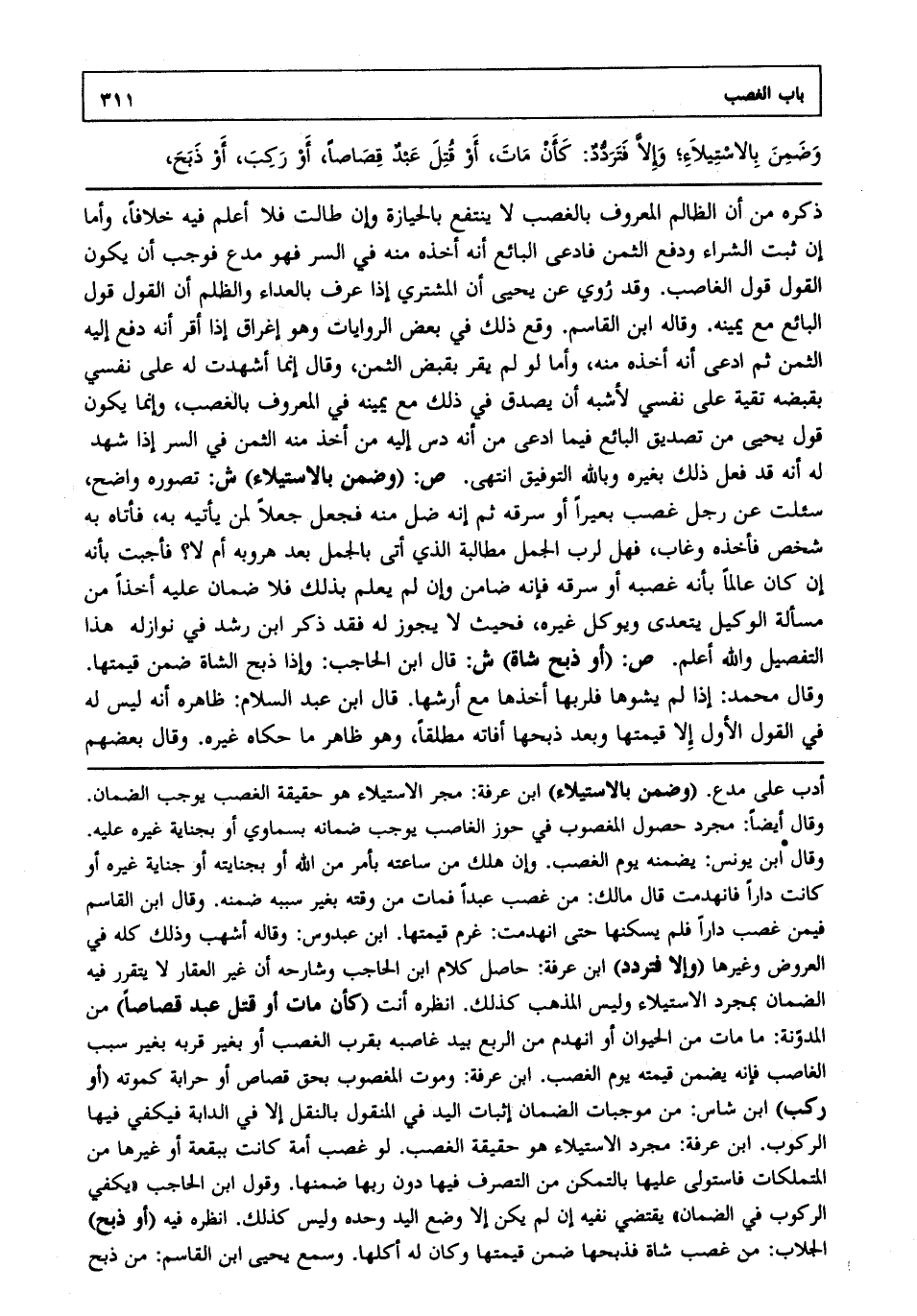 ذكره من أن الظالم المعروف بالغصب لا ينتفع بالحيازة وإن طالت فلا أعلم فيه خلافا وأما إن ثبت الشراء ودفع الثمن فادعى البائع أنه أخذه منه في السر فهو مدع فوجب أن يكون القول قول الغاصب وقد روي عن يحيى أن المشتري إذا عرف بالعداء والظلم أن القول قول البائع مع يمينه وقاله ابن القاسم وقع ذلك في بعض الروايات وهو إغراق إذا أقر أنه دفع إليه الثمن ثم ادعى أنه أخذه منه وأما لو لم يقر بقبض الثمن وقال: إنما أشهدت له على نفسي بقبضه تقية على نفسي لأشبه أن يصدق في ذلك مع يمينه في المعروف بالغصب وإنما يكون قول يحيى من تصديق البائع فيما ادعى من أنه دس إليه من أخذ منه الثمن في السر إذا شهد له أنه قد فعل ذلك بغيره، وبالله التوفيق، انتهى. ص: (وضمن بالاستيلاء) ش: تصوره واضح سئلت عن رجل غصب بعيرا أو سرقه ثم إنه ضل منه فجعل جعلا لمن يأتيه به فأتاه به شخص فأخذه وغاب فهل لرب الجمل مطالبة الذي أتى بالجمل بعد هروبه أم لا؟ فأجبت بأنه إن كان عالما بأنه غصبه أو سرقه فإنه ضامن وإن لم يعلم بذلك فلا ضمان عليه أخذا من مسألة الوكيل يتعدى ويوكل غيره فحيث لا يجوز له فقد ذكر ابن رشد في نوازله هذا التفصيل، والله أعلم. ص: (أو ذبح شاة) ش: قال ابن الحاجب: وإذا ذبح الشاة ضمن قيمتها وقال محمد: إذا لم يشوها فلربها أخذها مع أرشها قال ابن عبد السلام: ظاهره أنه ليس له في القول الأول إلا قيمتها وبعد ذبحها أفاته مطلقا. وهو ظاهر ما حكاه غيره. وقال بعضهم