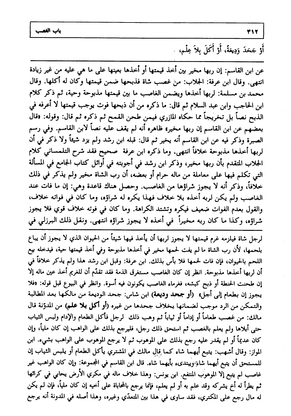 عن ابن القاسم: إن ربها مخير بين أخذ قيمتها أو أخذها بعينها على ما هي عليه من غير زيادة، انتهى. وقال ابن عرفة: الجلاب: من غصب شاة فذبحها ضمن قيمتها وكان له أكلها وقال محمد بن مسلمة: لربها أخذها ويضمن الغاصب ما بين قيمتها مذبوحة وحية ثم ذكر كلام ابن الحاجب وابن عبد السلام ثم قال ما ذكره من أن ذبحها فوت يوجب قيمتها لا أعرفه في الذبح نصا بل تخريجا مما حكاه المازري فيمن طحن القمح ثم ذكره ثم قال: وقوله: "قال بعضهم عن ابن القاسم إن ربها مخير" ظاهره أنه لم يقف عليه نصا لابن القاسم وفي رسم الصبرة وذكر فيه عن ابن القاسم أنه يخير ثم قال قبله ابن رشد ولم يزد شيئا ولا ذكر في أن لربها أخذها مذبوحة خلافا، انتهى. وما ذكره ابن عرفة صحيح فقد شرح التلمساني كلام الجلاب المتقدم بأن ربها مخير وذكر ابن رشد في أجوبته في أوائل كتاب الجامع في المسألة التي تكلم فيها على معاملة من ماله حرام أو بعضه أن رب الشاة مخير ولم يذكر في ذلك خلافا وذكر أنه لا يجوز شراؤها من الغاصب وحصل هناك قاعدة وهي أن ما فات عند الغاصب ولم يكن لربه أخذه بلا خلاف فهذا يكره له شراؤه وما كان في فواته خلاف والقول بعدم الفوات ضعيف فيكره وتشتد الكراهة وما كان في فوته خلاف قوي فلا يجوز شراؤه وكذا ما كان ربه مخيرا في أخذه لا يجوز شراؤه، انتهى. ونقل ذلك البرزلي في