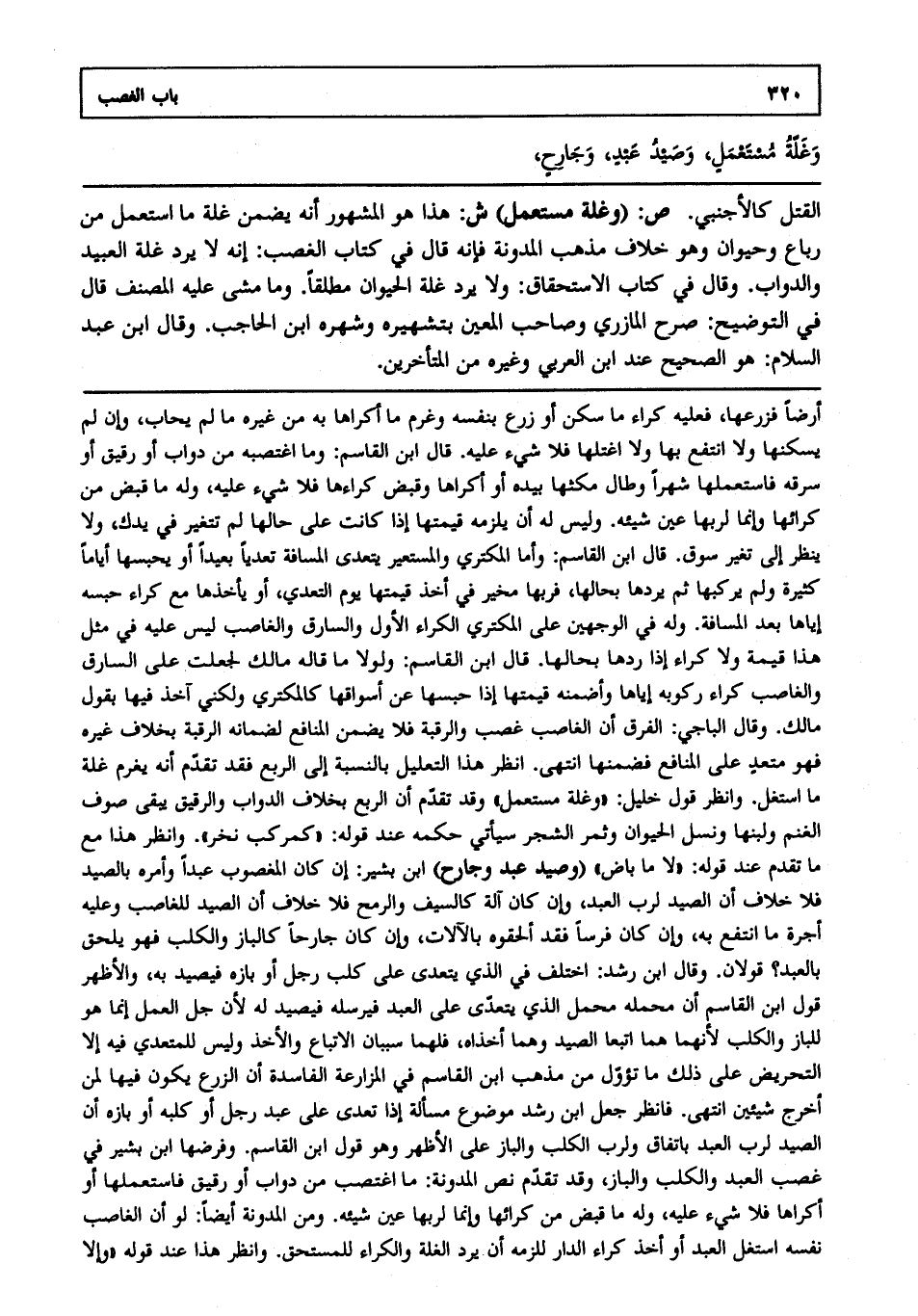 القتل كالأجنبي. ص: (وغلة مستعمل) ش: هذا هو المشهور أنه يضمن غلة ما استعمل من رباع وحيوان وهو خلاف مذهب المدونة فإنه قال في كتاب الغصب: إنه لا يرد غلة العبيد والدواب وقال في كتاب الاستحقاق: ولا يرد غلة الحيوان مطلقا وما مشى عليه المصنف قال في التوضيح: صرح المازري وصاحب المعين بتشهيره وشهره ابن الحاجب وقال ابن عبد السلام: هو الصحيح عند ابن العربي وغيره من المتأخرين.