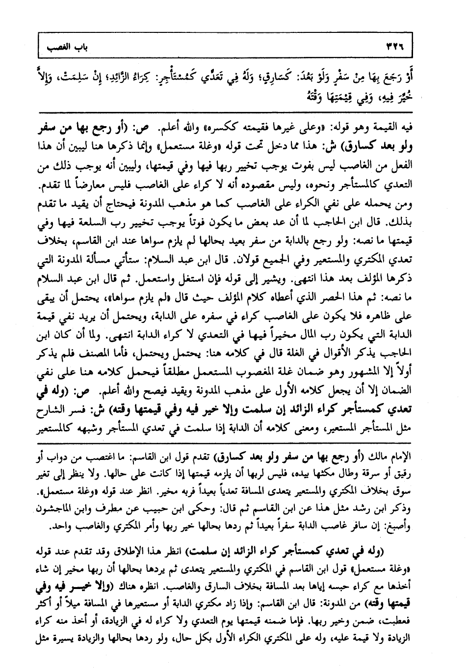 فيه القيمة وهو قوله: "وعلى غيرها فقيمته ككسره" والله أعلم. ص: (أو رجع بها من سفر ولو بعد كسارق) ش: هذا مما دخل تحت قوله: "وغلة مستعمل". وإنما ذكرها هنا ليبين أن هذا الفعل من الغاصب ليس بفوت يوجب تخيير ربها فيها وفي قيمتها وليبين أنه يوجب ذلك من التعدي كالمستأجر ونحوه وليس مقصوده أنه لا كراء على الغاصب فليس معارضا لما تقدم ومن يحمله على نفي الكراء على الغاصب كما هو مذهب المدونة فيحتاج أن يقيد ما تقدم بذلك قال ابن الحاجب لما أن عد بعض ما يكون فوتا يوجب تخيير رب السلعة فيها وفي قيمتها ما نصه: ولو رجع بالدابة من سفر بعيد بحالها لم يلزم سواها عند ابن القاسم بخلاف تعدي المكتري والمستعير وفي الجميع قولان قال ابن عبد السلام: ستأتي مسألة المدونة التي ذكرها المؤلف بعد هذا، انتهى. ويشير إلى قوله فإن استغل واستعمل ثم قال ابن عبد السلام ما نصه: ثم هذا الحصر الذي أعطاه كلام المؤلف حيث قال: "لم يلزم سواها"، يحتمل أن يبقى على ظاهره فلا يكون على الغاصب كراء في سفره على الدابة ويحتمل أن يريد نفي قيمة الدابة التي يكون رب المال مخيرا فيها في التعدي لا كراء الدابة، انتهى. ولما أن كان ابن الحاجب يذكر الأقوال في الغلة قال في كلامه هنا: يحتمل ويحتمل فأما المصنف فلم يذكر أولا إلا المشهور وهو ضمان غلة المغصوب المستعمل مطلقا فيحمل كلامه هنا على نفي الضمان إلا أن يجعل كلامه الأول على مذهب المدونة ويقيد فيصح، والله أعلم. ص: (وله في تعدي كمستأجر كراء الزائد إن سلمت وإلا خير فيه وفي قيمتها وقته) ش: فسر الشارح مثل المستأجر المستعير ومعنى كلامه أن الدابة إذا سلمت في تعدي المستأجر وشبهه كالمستعير