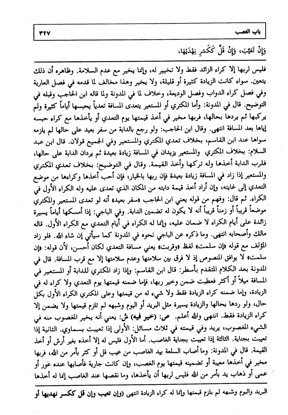 فليس لربها إلا كراء الزائد فقط ولا تخيير له، وإنما يخير مع عدم السلامة. وظاهره أن ذلك يتعين سواء كانت الزيادة كثيرة أو قليلة ولا يخير وهذا مخالف لما قدمه في فصل العارية وفي فصل كراء الدواب وفصل الوديعة وخلاف لما في المدونة ولما قاله ابن الحاجب وقبله في التوضيح قال في المدونة: وأما المكتري أو المستعير يتعدى المسافة تعديا يحبسها أياما كثيرة ولم يركبها ثم يردها بحالها فربها مخير في أخذ قيمتها يوم التعدي أو يأخذها مع كراء حبسه إياها بعد المسافة، انتهى. وقال ابن الحاجب ولو رجع بالدابة من سفر بعيد على حالها لم يلزمه سواها عند ابن القاسم بخلاف تعدي المكتري والمستعير وفي الجميع قولان قال ابن عبد السلام بخلاف المكتري والمستعير يزيدان في المسافة زيادة بعيدة ثم يردان الدابة على حالها فلرب الدابة أخذها وله تركها وأخذ القيمة وقال في التوضيح: بخلاف تعدي المكتري والمستعير إذا زاد في المسافة زيادة بعيدة فإن ربها بالخيار فإن أحب أخذها وكراءها من موضع التعدي إلى غايته وإن أراد أخذ قيمة دابته من المكان الذي تعدى عليه وله الكراء الأول في الكراء ثم قال: وفهم من قوله يعني ابن الحاجب: "سفر بعيد" أنه لو تعدى المستعير والمكتري موضعا قريبا أو زمنا قريبا أنه لا يكون له تضمين الدابة وفي الباجي إذا أمسكها أياما يسيرة زائدة على أيام الكراء لا ضمان عليه وإنما له الكراء في أيام التعدي مع الكراء الأول قاله مالك وأصحابه، انتهى. وما ذكره عن الباجي نحوه في المدونة كما سيأتي إن شاء الله فلو زاد المؤلف مع قوله: "إن سلمت" لفظ "وقربت" يعني مسافة التعدي لكان أحسن؛ لأن قوله: "إن سلمت" لا يوافق المنصوص؛ إذ لا فرق بين سلامتها وعدم سلامتها إلا مع قرب المسافة قال في المدونة بعد الكلام المتقدم بأسطر قال ابن القاسم: وإذا زاد المكتري للدابة أو المستعير في المسافة ميلا أو أكثر فعطبت ضمن وخير ربها فإما ضمنه قيمتها يوم التعدي ولا كراء له في الزيادة وإما ضمنه كراء الزيادة فقط ولا شيء له من قيمتها وعلى المكتري الكراء الأول بكل حال ولو ردها بحالها والزيادة يسيرة مثل البريد أو اليوم وشبهه لم تلزم قيمتها ولا يضمن إلا كراء الزيادة فقط، انتهى، والله أعلم. ص: (خير فيه) ش: يعني أنه يخير المغصوب منه في الشيء المغصوب يريد وفي قيمته في ثلاث مسائل، الأولى: إذا تعيبت بسماوي، الثانية: إذا تعيبت بجناية، الثالثة: إذا تعيبت بجناية الغاصب. أما الأول فليس له إلا أخذه بغير أرش أو أخذ القيمة قال في المدونة: وما أصاب السلعة بيد الغاصب من عيب قل أو كثر بأمر من الله فربها مخير في أخذها معيبة أو تضمينه قيمتها يوم الغصب وإن كانت جارية فأصابها عنده عور أو عمى أو ذهاب يد بأمر من الله فليس لربها أن يأخذها وما نقصها عند الغاصب إنما له أخذها