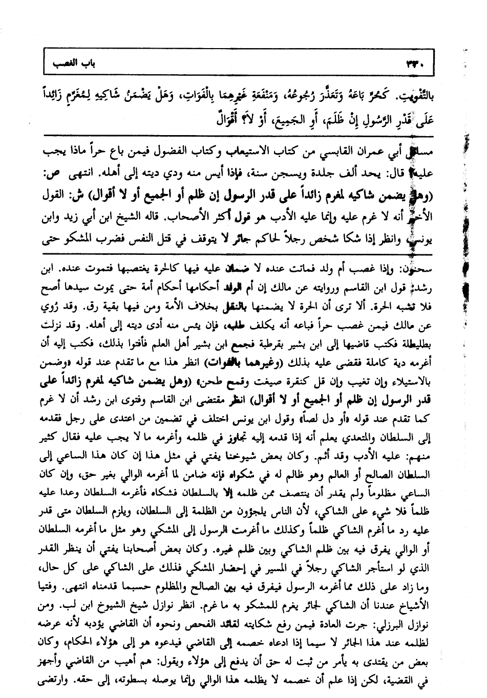 مسائل أبي عمران القابسي من كتاب الاستيعاب وكتاب الفضول فيمن باع حرا ماذا يجب عليه قال يحد ألف جلدة ويسجن سنة فإذا أيس منه ودى ديته إلى أهله، انتهى. ص: (وهل يضمن شاكيه لمغرم زائدا على قدر الرسول إن ظلم أو الجميع أو لا؟ أقوال) ش: القول الأخير أنه لا غرم عليه وإنما عليه الأدب هو قول أكثر الأصحاب قاله الشيخ ابن أبي زيد وابن يونس وانظر إذا شكا شخص رجلا لحاكم جائر لا يتوقف في قتل النفس فضرب المشكو حتى