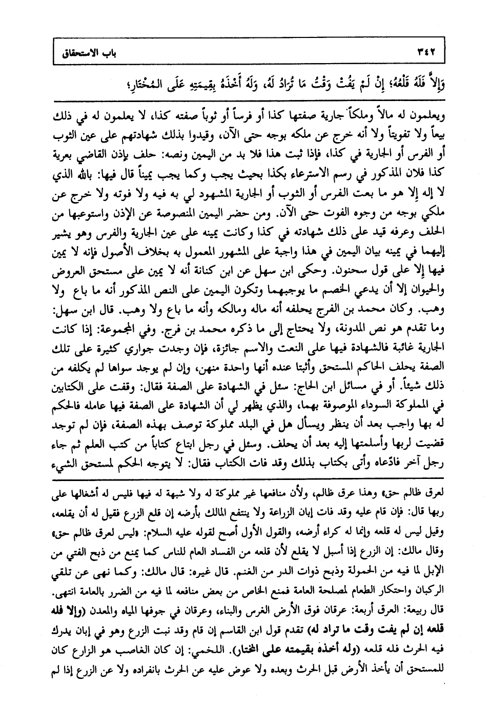 ويعلمون له مالا وملكا جارية صفتها كذا أو فرسا أو ثوبا صفته كذا لا يعلمون له في ذلك بيعا ولا تفويتا ولا أنه خرج عن ملكه بوجه حتى الآن وقيدوا بذلك شهادتهم على عين الثوب أو الفرس أو الجارية في كذا فإذا ثبت هذا فلا بد من اليمين ونصه: حلف بإذن القاضي بعرية كذا فلان المذكور في رسم الاسترعاء بكذا بحيث يجب وكما يجب يمينا قال فيها بالله الذي لا إله إلا هو ما بعت الفرس أو الثوب أو الجارية المشهود لي به فيه ولا فوته ولا خرج عن ملكي بوجه من وجوه الفوت حتى الآن ومن حضر اليمين المنصوصة عن الإذن واستوعبها من الحالف وعرفه قيد على ذلك شهادته في كذا وكانت يمينه على عين الجارية والفرس وهو يشير إليهما في يمينه بيان اليمين في هذا واجبة على المشهور المعمول به بخلاف الأصول فإنه لا يمين فيها إلا على قول سحنون. وحكى ابن سهل عن ابن كنانة أنه لا يمين على مستحق العروض والحيوان إلا أن يدعي الخصم ما يوجبهما وتكون اليمين على النص المذكور أنه ما باع ولا وهب وكان محمد بن الفرج يحلفه أنه ماله ومالكه وأنه ما باع ولا وهب قال ابن سهل وما تقدم هو نص المدونة ولا يحتاج إلى ما ذكره محمد بن فرج وفي المجموعة إذا كانت الجارية غائبة فالشهادة فيها على النعت والاسم جائزة فإن وجدت جواري كثيرة على تلك الصفة يحلف الحاكم المستحق وأثبتا عنده أنها واحدة منهن وإن لم يوجد سواها لم يكلفه من ذلك شيئا وفي مسائل. ابن الحاج سئل في الشهادة على الصفة فقال: وقفت على الكتابين في المملوكة السوداء الموصوفة بهما. والذي يظهر لي أن الشهادة على الصفة فيها عاملة فالحكم له بها واجب بعد أن ينظر ويسأل هل في البلد مملوكة توصف بهذه الصفة؟ فإن لم توجد قضيت لربها وأسلمتها إليه بعد أن يحلف. وسئل في رجل ابتاع كتابا من كتب العلم ثم جاء رجل آخر فادعاه وأتى بكتاب بذلك وقد فات الكتاب فقال: لا يتوجه الحكم لمستحق الشيء