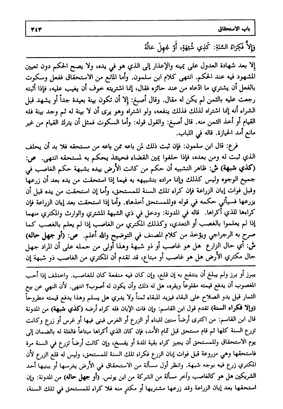 فرع: قال ابن سلمون: فإن ثبت ذلك لمن باعه ممن باعه من مستحقه فلا بد أن يحلف الذي ثبت له ومن بعده فإذا حلفوا يمين القضاء فحينئذ يحكم به لمستحقه، انتهى. ص: (كذي شبهة) ش: ظاهر التشبيه أن حكم من كانت الأرض بيده بشبهة حكم الغاصب في جميع الوجوه وليس كذلك وإنما مراده بتشبيهه به فيما إذا استحقت من يده بعد أن زرعها وقبل فوات إبان الزراعة فإن كراء تلك السنة للمستحق وأما إن استحقت من يده قبل أن يزرعها فسيأتي حكمه في قوله: "وللمستحق أخذها". وأما إذا استحقت بعد إبان الزراعة فإن كراءها للذي أكراها قاله في المدونة ودخل في ذي الشبهة المشتري والوارث والمكتري منهما إذا لم يعلموا بالغصب أو التعدي وكذلك المكتري من الغاصب إذا لم يعلم بالغصب كما صرح به الرجراجي ويؤخذ من كلام المصنف في التوضيح، والله أعلم. ص: (أو جهل حاله) ش: أي حال الزارع هل هو غاصب أو ذو شبهة؟ وهذا أولى من حمله على أن المراد جهل حال مكتري الأرض هل هو غاصب أو مبتاع؟ قد تقدم أن المكتري من الغاصب ذو شبهة إن