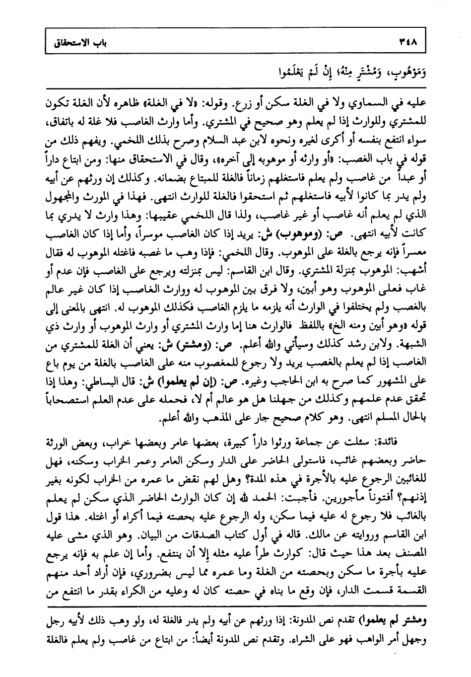 عليه في السماوي ولا في الغلة سكن أو زرع وقوله: "لا في الغلة" ظاهره؛ لأن الغلة تكون للمشتري وللوارث إذا لم يعلم وهو صحيح في المشتري وأما وارث الغاصب فلا غلة له باتفاق سواء انتفع بنفسه أو أكرى لغيره. ونحوه لابن عبد السلام وصرح بذلك اللخمي ويفهم ذلك من قوله في باب الغصب: "أو وارثه أو موهوبه إلى آخره"، وقال في الاستحقاق منها: ومن ابتاع دارا أو عبدا من غاصب ولم يعلم فاستغلهم زمانا فالغلة للمبتاع بضمانه وكذلك إن ورثهم عن أبيه ولم يدر بما كانوا لأبيه فاستغلهم ثم استحقوا فالغلة للوارث، انتهى. فهذا في المورث والمجهول الذي لم يعلم أنه غاصب أو غير غاصب ولذا قال اللخمي عقيبها: وهذا وارث لا يدري بما كانت لأبيه، انتهى. ص: (وموهوب) ش: يريد إذا كان الغاصب موسرا وأما إذا كان الغاصب معسرا فإنه يرجع بالغلة على الموهوب وقال اللخمي: فإذا وهب ما غصبه فاغتله الموهوب له فقال أشهب: الموهوب بمنزلة المشتري وقال ابن القاسم ليس بمنزلته ويرجع على الغاصب فإن أعدم أو غاب فعلى الموهوب وهو أبين ولا فرق بين الموهوب له ووارث الغاصب إذا كان غير عالم بالغصب ولم يختلفوا في الوارث أنه يلزمه ما يلزم الغاصب فكذلك الموهوب له، انتهى. بالمعنى إلى قوله: "وهو أبين ومنه إلخ". باللفظ فالوارث هنا إما وارث المشتري أو وارث الموهوب أو وارث ذي الشبهة ولابن رشد كذلك وسيأتي، والله أعلم. ص: (ومشتر) ش: يعني أن الغلة للمشتري من الغاصب إذا لم يعلم بالغصب يريد ولا رجوع للمغصوب منه على الغاصب بالغلة من يوم باع على المشهور كما صرح به ابن الحاجب وغيره. ص: (إن لم يعلموا) ش: قال البساطي وهذا إذا تحقق عدم علمهم وكذلك من جهلنا هل هو عالم أم لا؟ فحمله على عدم العلم استصحابا لحال المسلم، انتهى. وهو كلام صحيح جار على المذهب، والله أعلم.