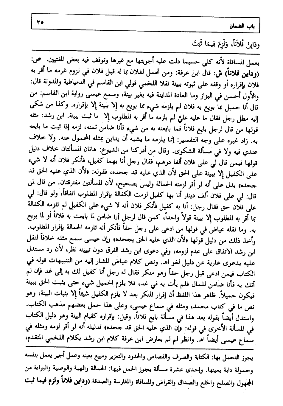 بعمل المساقاة، لأنه كلي حسبما دلت عليه أجوبتها مع غيرها وتوقف فيه بعض المفتين. ص: (وداين فلانا) ش: قال ابن عرفة ومن تحمل لفلان بماله قبل فلان في لزوم غرمه ما أقر به فلان بإقراره، أو وقفه على ثبوته ببينة نقل اللخمي قولي ابن القاسم في الدمياطية والمدونة قال والأول أحسن في البزاز وما العادة المداينة فيه بغير بينة وسمع عيسى رواية ابن القاسم من قال أنا حميل بما بويع به فلان لم يلزمه شيء مما بويع به إلا ببينة إلا بإقراره وكذا من شكي إليه مطل رجل فقال ما عليه علي لم يلزمه ما أقر به المطلوب إلا ما ثبت ببينة ابن رشد مثله قولها من قال لرجل بايع فلانا فما بايعته به من شيء فأنا ضامن ثمنه لزمه إذا ثبت ما بايعه به زاد غيره على وجه التفسير إنما يلزمه ما يشبه أن يداين بمثله المحمول عنه ولا خلاف عندي فيه ولا في مسألة الشكوى. وقال من أدركنا من الشيوخ: هاتان المسألتان خلاف دليل قولها فيمن قال: لي على فلان ألف درهم فقال رجل أنا بهما كفيل فأنكر فلان أنه لا شيء على الكفيل إلا ببينة على الحق؛ لأن الذي عليه قد جحده فقوله؛ لأن الذي عليه الحق قد جحده يدل على أنه لو أقر لزمته الحمالة وليس بصحيح؛ لأن المسألتين مفترقتان من قال لمن قال: لي على فلان ألف دينار أنا بها كفيل لزمت الكفالة بإقرار المطلوب اتفاقا ولو قال: لي على فلان حق فقال رجل أنا به كفيل فأنكر فلان أنه لا شيء على الكفيل لم تلزمه الكفالة بما أقر به المطلوب إلا ببينة قولا واحدا كمن قال لرجل أنا ضامن لما بايعت به فلانا، أو لما بويع به وما نقله عياض في قولها: من ادعى على رجل حقا فأنكر أنه تلزمه الحمالة بإقرار المطلوب وأخذ ذلك من دليل قولها: "لأن الذي عليه الحق يجحده". وأن عيسى سمع مثله خلافا لنقل ابن رشد الاتفاق على عدم لزومه وفي دعوى ابن رشد الفرق دون تبيينه نظر؛ لأن رد مستدل عليه بدعوى عارية عن دليل لغو ا هـ ونص كلام عياض المشار إليه من التنبيهات قوله في الكتاب فيمن ادعى قبل رجل حقا وهو منكر فقال له رجل أنا كفيل لك به إلى غد فإن لم آتك به فأنا ضامن للمال فلم يأت به في غد فلا يلزم الحميل شيء حتى يثبت الحق ببينة فيكون حميلا، ظاهر هذا اللفظ أن إقرار المنكر بعد لا يلزم الكفيل شيء إلا بثبات البينة وهو نص ما في كتاب محمد ومثله في سماع عيسى وعلى هذا حمل بعضهم مذهب الكتاب واستدل أيضا بقوله بعد هذا في مسألة بايع فلانا وقيل بإقراره كقيام البينة وهو دليل الكتاب في المسألة الأخرى في قوله إن الذي عليه الحق قد جحده فدليله أنه لو أقر لزمه ومثله في سماع عيسى أيضا ا هـ. وانظر لم لم يعارض ابن عرفة كلام ابن رشد بكلام اللخمي المتقدم،
