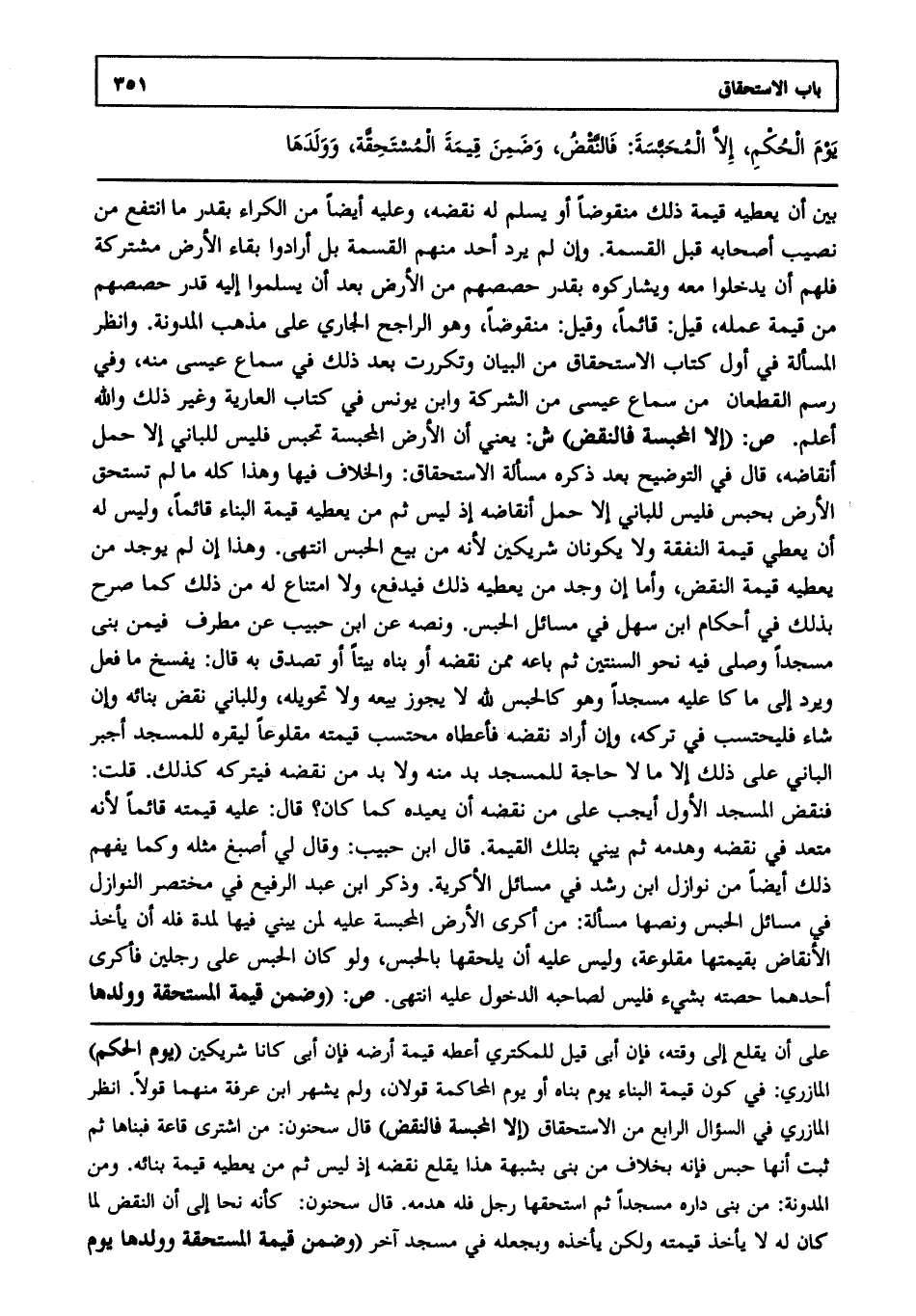 بين أن يعطيه قيمة ذلك منقوضا أو يسلم له نقضه وعليه أيضا من الكراء بقدر ما انتفع من نصيب أصحابه قبل القسمة وإن لم يرد أحد منهم القسمة بل أرادوا بقاء الأرض مشتركة فلهم أن يدخلوا معه ويشاركوه بقدر حصصهم من الأرض بعد أن يسلموا إليه قدر حصصهم من قيمة عمله قيل قائما وقيل منقوضا وهو الراجح الجاري على مذهب المدونة وانظر المسألة في أول كتاب الاستحقاق من البيان وتكررت بعد ذلك في سماع عيسى منه وفي رسم القطعان من سماع عيسى من الشركة وابن يونس في كتاب العارية وغير ذلك، والله أعلم. ص: (إلا المحبسة فالنقض) ش: يعني أن الأرض المحبسة تحبس فليس للباني إلا حمل أنقاضه قال في التوضيح بعد ذكره مسألة الاستحقاق: والخلاف فيها وهذا كله ما لم تستحق الأرض بحبس فليس للباني إلا حمل أنقاضه؛ إذ ليس ثم من يعطيه قيمة البناء قائما وليس له أن يعطي قيمة النفقة ولا يكونان شريكين؛ لأنه من بيع الحبس، انتهى. وهذا إن لم يوجد من يعطيه قيمة النقض وأما إن وجد من يعطيه ذلك فيدفع ولا امتناع له من ذلك كما صرح بذلك في أحكام ابن سهل في مسائل الحبس ونصه عن ابن حبيب عن مطرف فيمن بنى مسجدا وصلى فيه نحو السنتين ثم باعه ممن نقضه أو بناه بيتا أو تصدق به قال: يفسخ ما فعل ويرد إلى ما كان عليه مسجدا وهو كالحبس لله لا يجوز بيعه ولا تحويله وللباني نقض بنائه وإن شاء فليحتسب في تركه وإن أراد نقضه فأعطاه محتسب قيمته مقلوعا ليقره للمسجد أجبر الباني على ذلك إلا ما لا حاجة للمسجد بد منه ولا بد من نقضه فيتركه كذلك قلت فنقض المسجد الأول أيجب على من نقضه أن يعيده كما كان قال: عليه قيمته قائما؛ لأنه متعد في نقضه وهدمه ثم يبني بتلك القيمة قال ابن حبيب: وقال لي أصبغ مثله وكما يفهم ذلك أيضا من نوازل ابن رشد في مسائل الأكرية وذكر ابن عبد الرفيع في مختصر النوازل في مسائل الحبس ونصها: مسألة من أكرى الأرض المحبسة عليه لمن يبني فيها لمدة فله أن يأخذ الأنقاض بقيمتها مقلوعة وليس عليه أن يلحقها بالحبس ولو كان الحبس على رجلين فأكرى أحدهما حصته بشيء فليس لصاحبه الدخول عليه، انتهى. ص: (وضمن قيمة المستحقة وولدها