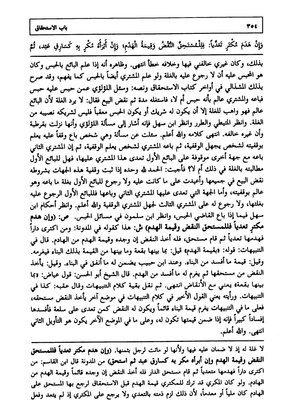 بذلك وكان غيري خالفني فيها وخلافه خطأ، انتهى. وظاهره أنه إذا علم البائع بالحبس وكان هو المحبس عليه أن لا رجوع عليه بالغلة ولو علم المشتري أيضا بالحبس كما يفهم وقد صرح بذلك المشذالي في أواخر كتاب الاستحقاق ونصه: وسئل اللؤلؤي عمن حبس عليه حبس فباعه والمشتري عالم بأنه حبس أم لا فاستغله مدة ثم نقض البيع فقال: لا يرد الغلة؛ لأن البائع عالم فهو واهب للغلة إلا أن يكون له شريك أو يكون الحبس معقبا فليس لشريكه نصيبه من الغلة وانظر المتيطي والطرر وانظر ابن سهل فإنه أشار إلى مسألة اللؤلؤي وأنها نزلت بقرطبة وأن غيره خالفه، انتهى. كلامه، والله أعلم. سئلت عن مسألة وهي: شخص باع وقفا عليه يعلم بوقفيته لشخص يجهل الوقفية ثم باعه المشتري لشخص يعلم الوقفية ثم إن المشتري الثاني باعه مع جهة أخرى موقوفة على البائع الأول تعدى هذا المشتري عليها فهل للبائع الأول مطالبته بالغلة في ذلك أم لا؟ فأجبت الحمد لله وحده إذا ثبت وقفية هذه الجهات بشروطه نقض البيع في جميعها وأعيدت على ما كانت عليه ولا رجوع للبائع الأول بغلة ما باعه وهو عالم بوقفيته وأما الجهة التي تعدى عليها المشتري الثاني وباعها فللبائع الأول الرجوع عليه بغلتها ولا رجوع له على المشتري الثالث لجهل المشتري الوقفية، والله أعلم. وانظر أحكام ابن سهل فيما إذا باع القاضي الحبس وانظر ابن سلمون في مسائل الحبس. ص: (وإن هدم مكتر تعديا فللمستحق النقض وقيمة الهدم) ش: هذا كقوله في المدونة ومن اكترى دارا فهدمها تعديا ثم قام مستحق فله أخذ النقض إن وجده وقيمة الهدم من الهادم قال في التنبيهات: قوله: "بقيمة الهدم" قيل: بما بينها بقعة وما بينها من القيمة بذلك البناء فيغرمه وقيل: قيمة ما أفسد من البناء وعند ابن حبيب يضمن له ما أنفق في البناء وقيل: يأخذ النقض من مستحقها ثم يغرم له ما أفسد من الهدم قال الشيخ أبو الحسن قول عياض: "بما بينها بقعة" يعني مع الأنقاض، انتهى. ثم نقل بقية كلام التنبيهات وقال عقبه: كذا في التنبيهات ورأيته يعني القول الأخير في كلام التنبيهات في موضع آخر يأخذ النقض مستحقه فعلى ما في التنبيهات يغرم قيمة البناء قائما ويكون له النقض كمن تعدى على سلعة فأفسدها إفسادا كبيرا فإنه إذا ضمن قيمتها تكون له وعلى ما في الموضع الآخر يكون هو التأويل الثاني، انتهى، والله أعلم.