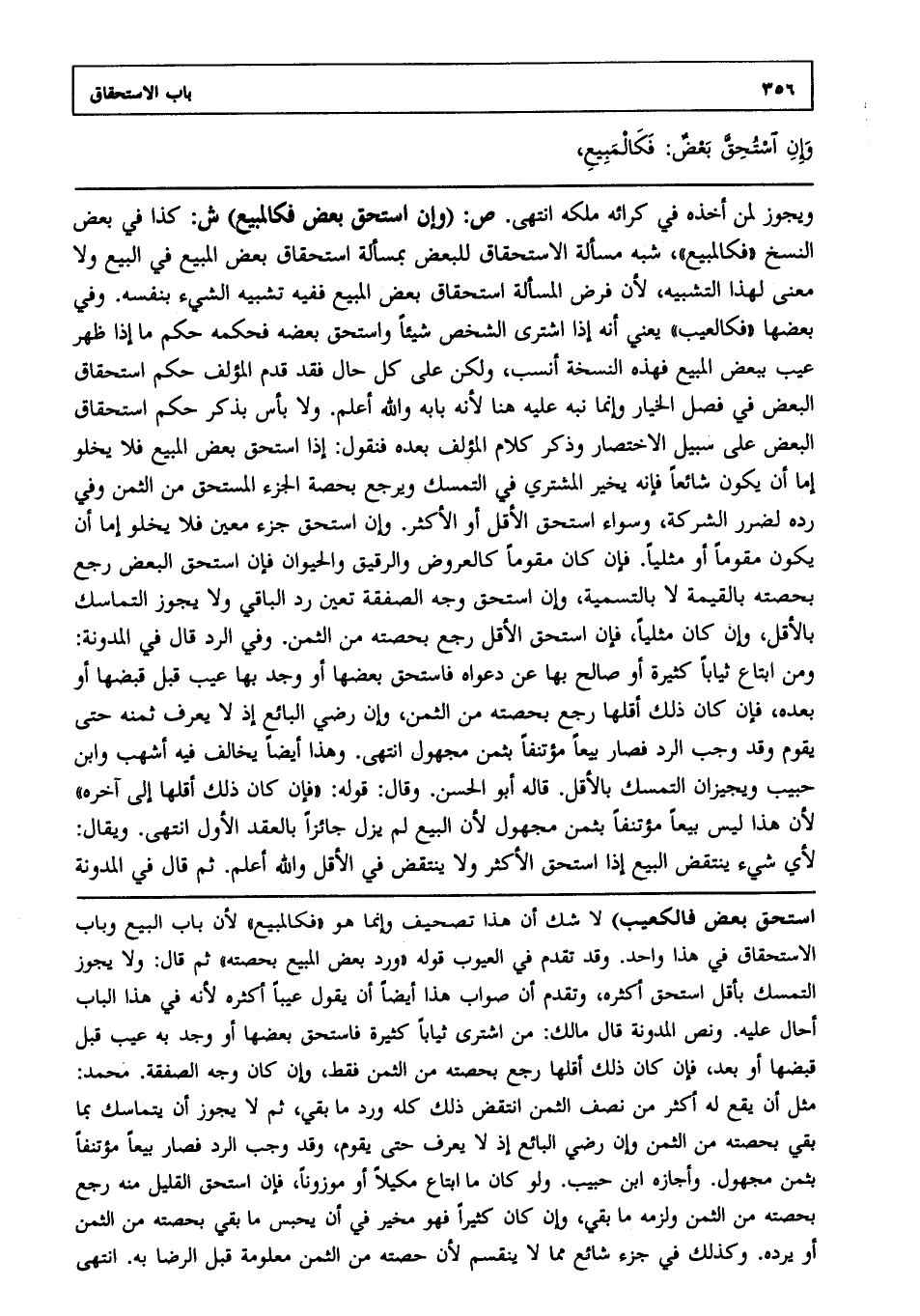 ويجوز لمن أخذه في كرائه ملكه، انتهى. ص: (وإن استحق بعض فكالمبيع) ش: كذا في بعض النسخ "فكالمبيع" شبه مسألة الاستحقاق للبعض بمسألة استحقاق بعض المبيع في البيع ولا معنى لهذا التشبيه؛ لأن فرض المسألة استحقاق بعض المبيع ففيه تشبيه الشيء بنفسه وفي بعضها "فكالعيب" يعني أنه إذا اشترى الشخص شيئا واستحق بعضه فحكمه حكم ما إذا ظهر عيب ببعض المبيع فهذه النسخة أنسب ولكن على كل حال فقد قدم المؤلف حكم استحقاق البعض في فصل الخيار وإنما نبه عليه هنا؛ لأنه بابه، والله أعلم. ولا بأس بذكر حكم استحقاق البعض على سبيل الاختصار وذكر كلام المؤلف بعده فنقول إذا استحق بعض المبيع فلا يخلو إما أن يكون شائعا فإنه يخير المشتري في التمسك ويرجع بحصة الجزء المستحق من الثمن وفي رده لضرر الشركة وسواء استحق الأقل أو الأكثر وإن استحق جزء معين فلا يخلو إما أن يكون مقوما أو مثليا فإن كان مقوما كالعروض والرقيق والحيوان فإن استحق البعض رجع بحصته بالقيمة لا بالتسمية وإن استحق وجه الصفقة تعين رد الباقي ولا يجوز التمسك بالأقل وإن كان مثليا فإن استحق الأقل رجع بحصته من الثمن وفي الرد قال في المدونة: ومن ابتاع ثيابا كثيرة أو صالح بها عن دعواه فاستحق بعضها أو وجد بها عيب قبل قبضها أو بعده فإن كان ذلك أقلها رجع بحصته من الثمن وإن رضي البائع؛ إذ لا يعرف ثمنه حتى يقوم وقد وجب الرد فصار بيعا مؤتنفا بثمن مجهول، انتهى. وهذا أيضا يخالف فيه أشهب وابن حبيب ويجيزان التمسك بالأقل قاله أبو الحسن وقال: قوله: "فإن كان ذلك أقلها إلى آخره" لأن هذا ليس بيعا مؤتنفا بثمن مجهول؛ لأن البيع لم يزل جائزا بالعقد الأول، انتهى. ويقال لأي شيء ينتقض البيع إذا استحق الأكثر ولا ينتقض في الأقل، والله أعلم. ثم قال في المدونة
