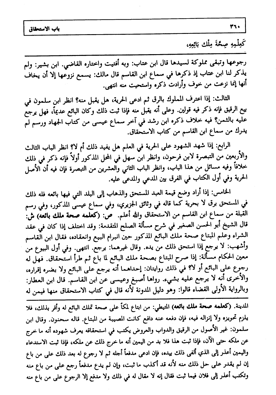 الثالث: إذا اعترف المملوك بالرق ثم ادعى الحرية، هل يقبل منه؟ انظر ابن سلمون في بيع الرقيق فإنه ذكر فيه قولين وعلى أنه يقبل منه فإذا ثبت ذلك وكان البائع عديما فهل يرجع عليه بالثمن؟ فيه خلاف ذكره ابن رشد في آخر سماع عيسى من كتاب الجهاد ورسم لم يدرك من سماع ابن القاسم من كتاب الاستحقاق.