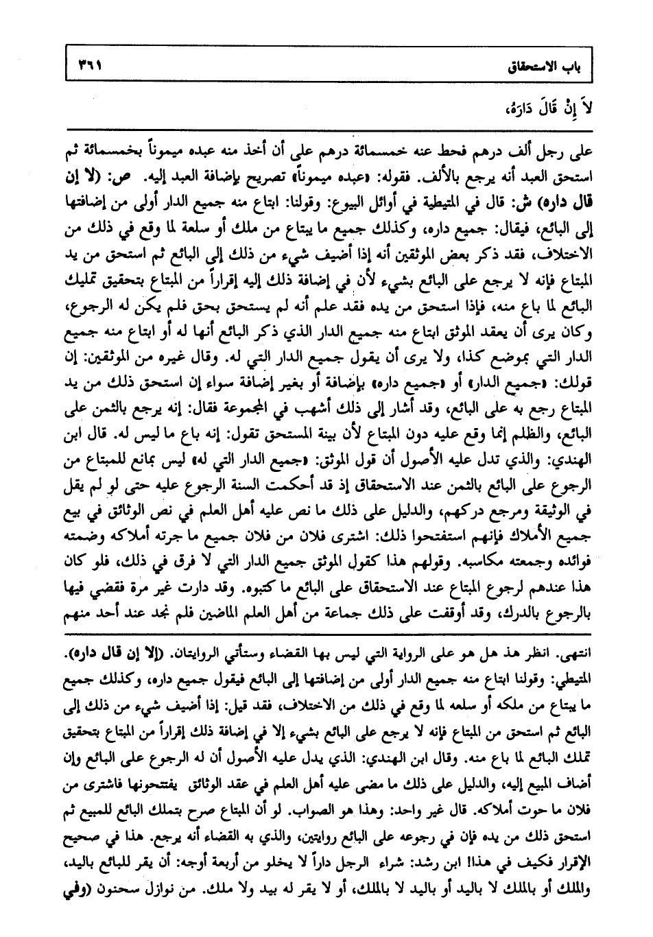 على رجل ألف درهم فحط عنه خمسمائة درهم على أن أخذ منه عبده ميمونا بخمسمائة ثم استحق العبد أنه يرجع بالألف فقوله: "عبده ميمونا" تصريح بإضافة العبد إليه. ص: (لا إن قال داره) ش: قال في المتيطية في أوائل البيوع: وقولنا: ابتاع منه جميع الدار أولى من إضافتها إلى البائع فيقال: جميع داره وكذلك جميع ما يبتاع من ملك أو سلعة لما وقع في ذلك من الاختلاف فقد ذكر بعض الموثقين أنه إذا أضيف شيء من ذلك إلى البائع ثم استحق من يد المبتاع فإنه لا يرجع على البائع بشيء؛ لأن في إضافة ذلك إليه إقرارا من المبتاع بتحقيق تمليك البائع لما باع منه فإذا استحق من يده فقد علم أنه لم يستحق بحق فلم يكن له الرجوع وكان يرى أن يعقد الموثق ابتاع منه جميع الدار الذي ذكر البائع أنها له أو ابتاع منه جميع الدار التي بموضع كذا ولا يرى أن يقول جميع الدار التي له، وقال غيره من الموثقين: إن قولك: "جميع الدار" أو "جميع داره" بإضافة أو بغير إضافة سواء إن استحق ذلك من يد المبتاع رجع به على البائع وقد أشار إلى ذلك أشهب في المجموعة، فقال: إنه يرجع بالثمن على البائع، والظلم إنما وقع عليه دون المبتاع؛ لأن بينة المستحق تقول إنه باع ما ليس له. قال ابن الهندي والذي تدل عليه الأصول أن قول الموثق: "جميع الدار التي له" ليس بمانع للمبتاع من الرجوع على البائع بالثمن عند الاستحقاق؛ إذ قد أحكمت السنة الرجوع عليه حتى لو لم يقل في الوثيقة ومرجع دركهم والدليل على ذلك ما نص عليه أهل العلم في نص الوثائق في بيع جميع الأملاك فإنهم استفتحوا ذلك: اشترى فلان من فلان جميع ما جرته أملاكه وضمته فوائده وجمعته مكاسبه. وقولهم هذا كقول الموثق: جميع الدار التي له، لا فرق في ذلك فلو كان هذا عندهم لرجوع المبتاع عند الاستحقاق على البائع ما كتبوه وقد دارت غير مرة فقضي فيها بالرجوع بالدرك وقد أوقفت على ذلك جماعة من أهل العلم الماضين فلم نجد عند أحد منهم