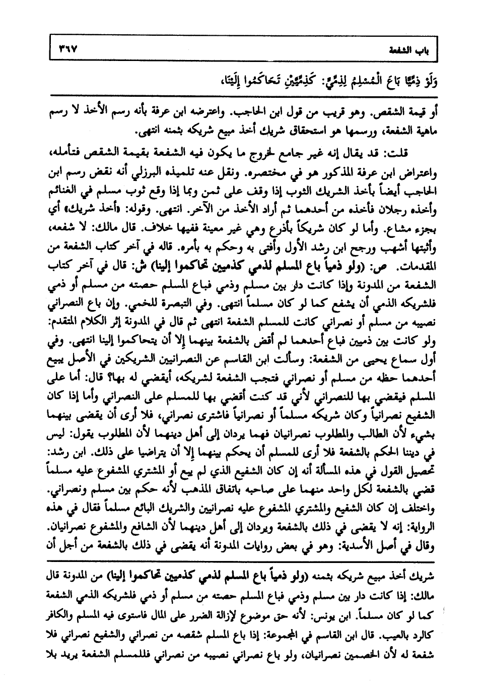 قلت: قد يقال: إنه غير جامع لخروج ما يكون فيه الشفعة بقيمة الشقص فتأمله واعتراض ابن عرفة المذكور هو في مختصره ونقل عنه تلميذه البرزلي أنه نقض رسم ابن الحاجب أيضا بأخذ الشريك الثوب إذا وقف على ثمن وبما إذا وقع ثوب مسلم في الغنائم وأخذه رجلان فأخذ من أحدهما ثم أراد الأخذ من الآخر، انتهى. وقوله: "أخذ شريك" أي بجزء مشاع وأما لو كان شريكا بأذرع وهي غير معينة ففيها خلاف، قال مالك: لا شفعة وأثبتها أشهب ورجح ابن رشد الأول وأفتى به وحكم به بأمره، قاله في آخر كتاب الشفعة من المقدمات. ص: (ولو ذميا باع المسلم لذمي كذميين تحاكموا إلينا) ش: قال في آخر كتاب الشفعة من المدونة: وإذا كانت دار بين مسلم وذمي فباع المسلم حصته من مسلم أو ذمي فلشريكه الذمي أن يشفع كما لو كان مسلما، انتهى. وفي التبصرة للخمي وإن باع النصراني نصيبه من مسلم أو نصراني كانت للمسلم الشفعة، انتهى. ثم قال في المدونة إثر الكلام المتقدم: ولو كانت بين ذميين فباع أحدهما لم أقض بالشفعة بينهما إلا أن يتحاكموا إلينا، انتهى. وفي أول سماع يحيى من الشفعة وسألت ابن القاسم عن النصرانيين الشريكين في الأصل يبيع أحدهما حظه من مسلم أو نصراني فتجب الشفعة لشريكه أيقضى له بها، قال: أما على المسلم فيقضى بها للنصراني لأني قد كنت أقضي بها للمسلم على النصراني وأما إذا كان الشفيع نصرانيا وكان شريكه مسلما أو نصرانيا فاشترى نصراني فلا أرى أن يقضى بينهما بشيء؛ لأن الطالب والمطلوب نصرانيان فهما يردان إلى أهل دينهما؛ لأن المطلوب يقول ليس في ديننا الحكم بالشفعة فلا أرى للمسلم أن يحكم بينهما إلا أن يتراضيا على ذلك ابن رشد تحصيل القول في هذه المسألة أنه إن كان الشفيع الذي لم يبع أو المشتري المشفوع عليه مسلما قضي بالشفعة لكل واحد منهما على صاحبه باتفاق المذهب؛ لأنه حكم بين مسلم ونصراني واختلف إن كان الشفيع والمشتري المشفوع عليه نصرانيين والشريك البائع مسلما، فقال في هذه الرواية: إنه لا يقضى في ذلك بالشفعة ويردان إلى أهل دينهما؛ لأن الشافع والمشفوع نصرانيان، وقال في أصل الأسدية وهو في بعض روايات المدونة: إنه يقضى في ذلك بالشفعة من أجل أن