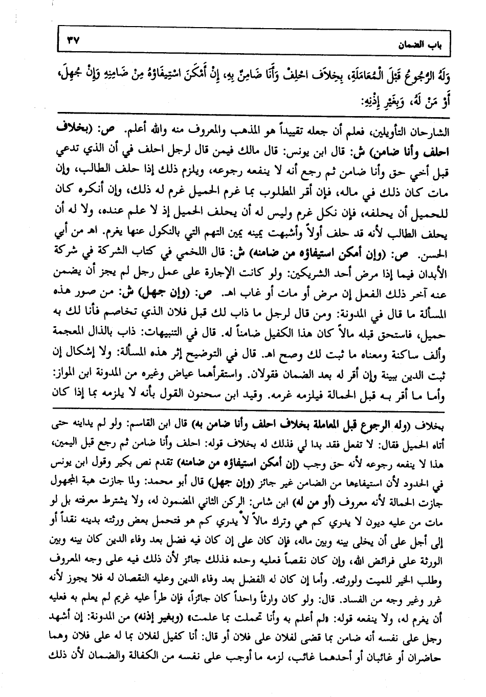 الشارحان التأويلين، فعلم أن جعله تقييدا هو المذهب والمعروف منه والله أعلم. ص: (بخلاف احلف وأنا ضامن) ش: قال ابن يونس: قال مالك فيمن قال لرجل احلف في أن الذي تدعي قبل أخي حق وأنا ضامن ثم رجع: إنه لا ينفعه رجوعه ويلزم ذلك إذا حلف الطالب، وإن مات كان ذلك في ماله فإن أقر المطلوب بما غرم الحميل غرم له ذلك، وإن أنكره كان للحميل أن يحلفه فإن نكل غرم وليس له أن يحلف الحميل إذ لا علم عنده ولا له أن يحلف الطالب، لأنه قد حلف أولا وأشبهت يمينه يمين التهم التي بالنكول عنها يغرم ا هـ من أبي الحسن. ص: (وإن أمكن استيفاؤه من ضامنه) ش: قال اللخمي في كتاب الشركة في شركة الأبدان فيما إذا مرض أحد الشريكين: ولو كانت الإجارة على عمل رجل لم يجز أن يضمن عنه آخر ذلك الفعل إن مرض، أو مات، أو غاب ا هـ. ص: (وإن جهل) ش: من صور هذه المسألة ما قال في المدونة ومن قال لرجل ما: ذاب لك قبل فلان الذي تخاصم فأنا لك به حميل فاستحق قبله مالا كان هذا الكفيل ضامنا له قال في التنبيهات ذاب بالذال المعجمة وألف ساكنة ومعناه ما ثبت لك وصح ا هـ قال في التوضيح إثر هذه المسألة ولا إشكال إن ثبت الدين ببينة، وإن أقر له بعد الضمان فقولان واستقرأهما عياض وغيره من المدونة وابن المواز وأما ما أقر به قبل الحمالة فيلزمه غرمه وقيد ابن سحنون القول بأنه لا يلزمه بما إذا كان