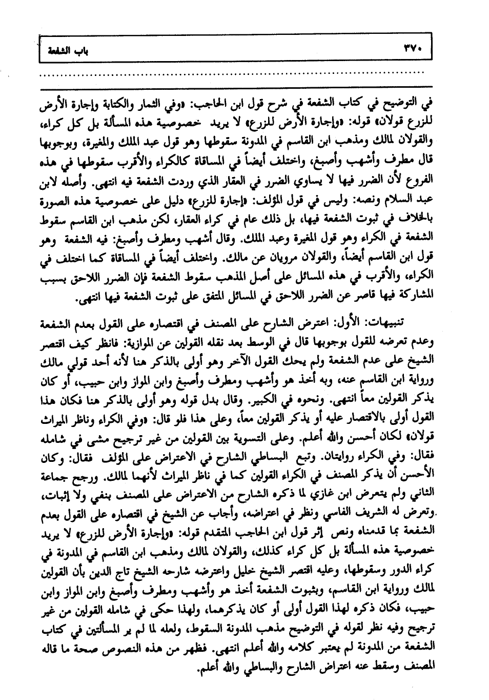 في التوضيح في كتاب الشفعة في شرح قول ابن الحاجب: "وفي الثمار والكتابة وإجارة الأرض للزرع قولان". قوله: "وإجارة الأرض للزرع". لا يريد خصوصية هذه المسألة بل كل كراء. والقولان لمالك ومذهب ابن القاسم في المدونة سقوطها وهو قول عبد الملك والمغيرة وبوجوبها قال مطرف وأشهب وأصبغ واختلف أيضا في المساقاة كالكراء، والأقرب سقوطها في هذه الفروع؛ لأن الضرر فيها لا يساوي الضرر في العقار الذي وردت الشفعة فيه، انتهى. وأصله لابن عبد السلام ونصه وليس في قول المؤلف: "وإجارة للزرع" دليل على خصوصية هذه الصورة بالخلاف في ثبوت الشفعة فيها بل ذلك عام في كراء العقار لكن مذهب ابن القاسم سقوط الشفعة في الكراء وهو قول المغيرة وعبد الملك، وقال أشهب ومطرف وأصبغ: فيه الشفعة وهو قول ابن القاسم أيضا، والقولان مرويان عن مالك واختلف أيضا في المساقاة كما اختلف في الكراء والأقرب في هذه المسائل على أصل المذهب سقوط الشفعة فإن الضرر اللاحق بسبب المشاركة فيها قاصر عن الضرر اللاحق في المسائل المتفق على ثبوت الشفعة فيها، انتهى.