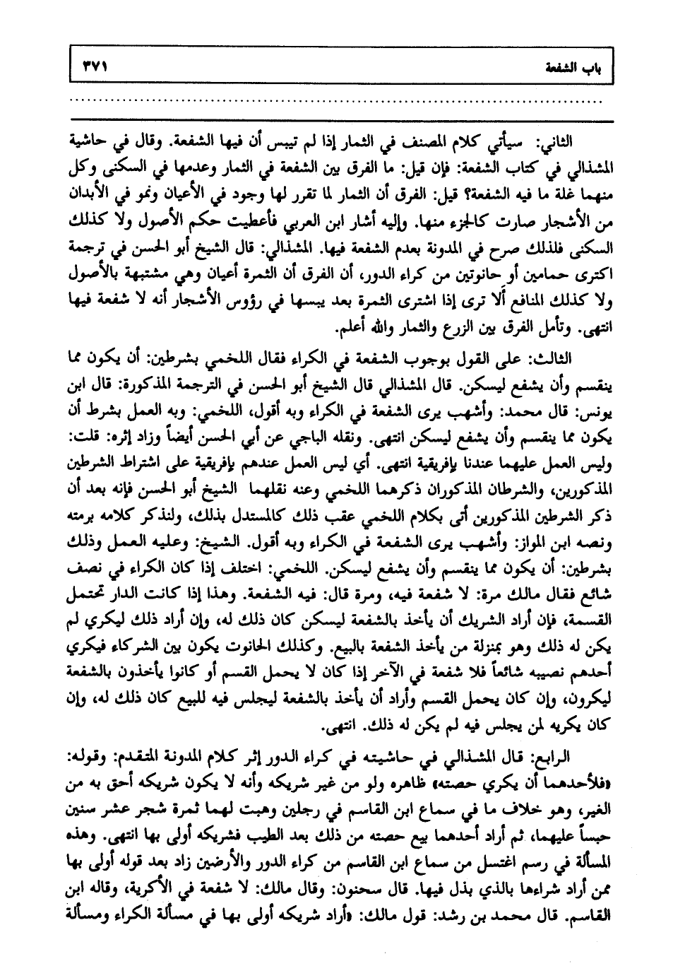 الثالث: على القول بوجوب الشفعة في الكراء، فقال اللخمي بشرطين: أن يكون مما ينقسم وأن يشفع ليسكن، قال المشذالي، قال الشيخ أبو الحسن في الترجمة المذكورة: قال ابن يونس، قال محمد وأشهب يرى الشفعة في الكراء وبه أقول. اللخمي وبه العمل بشرط أن يكون مما ينقسم وأن يشفع ليسكن، انتهى. ونقله الباجي عن أبي الحسن أيضا وزاد إثره. قلت: وليس العمل عليهما عندنا بإفريقية، انتهى. أي ليس العمل عندهم بإفريقية على اشتراط الشرطين المذكورين، والشرطان المذكوران ذكرهما اللخمي وعنه نقلهما الشيخ أبو الحسن فإنه بعد أن ذكر الشرطين المذكورين أتى بكلام اللخمي عقب ذلك كالمستدل بذلك ولنذكر كلامه برمته ونصه ابن المواز وأشهب يرى الشفعة في الكراء وبه أقول الشيخ وعليه العمل وذلك بشرطين أن يكون مما ينقسم وأن يشفع ليسكن اللخمي. اختلف إذا كان الكراء في نصف شائع، فقال مالك مرة لا شفعة فيه ومرة قال: فيه الشفعة وهذا إذا كانت الدار تحتمل القسمة فإن أراد الشريك أن يأخذ بالشفعة ليسكن كان ذلك له وإن أراد ذلك ليكري لم يكن له ذلك وهو بمنزلة من يأخذ الشفعة بالبيع وكذلك الحانوت يكون بين الشركاء فيكري أحدهم نصيبه شائعا فلا شفعة في الآخر إذا كان لا يحتمل القسم أو كانوا يأخذون بالشفعة ليكرون وإن كان يحتمل القسم وأراد أن يأخذ بالشفعة ليجلس فيه للبيع كان ذلك له وإن كان يكريه لمن يجلس فيه لم يكن له ذلك، انتهى.